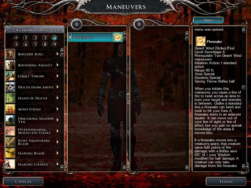 A few things to remember for those having issues and haven't checked the author's notes: 1) Always select party members using their portraits for ToB abilities, some limitation of the NWN2 scripting engine can cause odd behavior when you select by clicking on the character model. 2) Some scripts output "+0" notices for attacks, damage or healing that don't seem attached to anything (e.g. "Blood in the Water" stance or "Wolverine" stance) - you can ignore these they are just background script output. 3) Every time you go to the maneuvers "level up" screen, you can only choose/swap maneuvers for one level of advancement. In other words, if your Warblade went from Level 5 to 8 and you didn't level up your maneuvers during that time, you'll have to visit the maneuver level up screen 3 times (once for level 6, once for level 7, once for level 8) to get all of your maneuvers and options. Also when you import your character from OC to MotB, you will have to re-select your maneuvers (by going to the maneuver level-up screen 20 times, one for each level), as the NWN2 character file can't store your maneuver loadout.