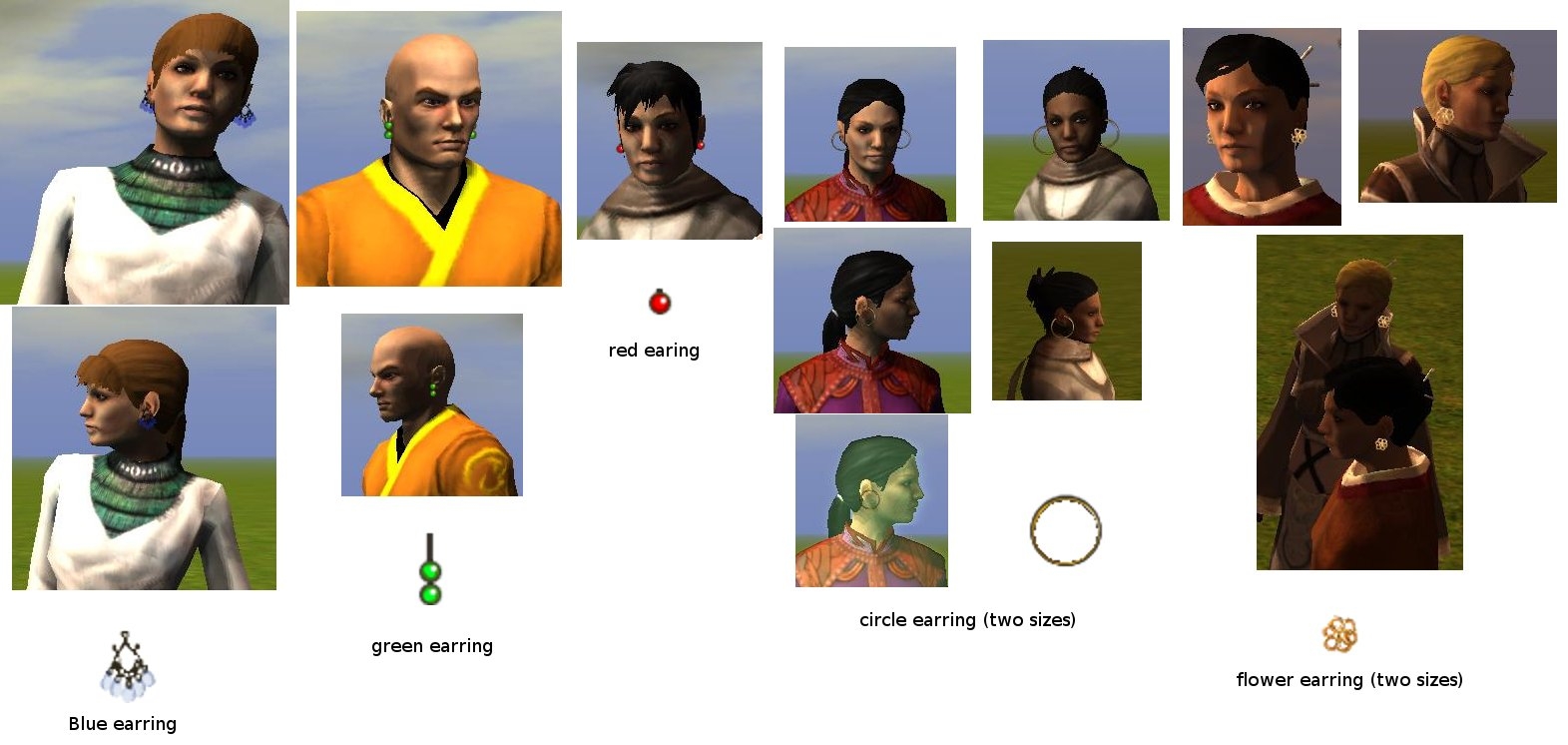 for now, an earring is a plane texture attached to each ear (via an effect), always turned in front of the current view. For piercings, it probably would be less difficult to use an object instead of a plane texture. But for some strange reason I'm not able to create/export objects with blender...