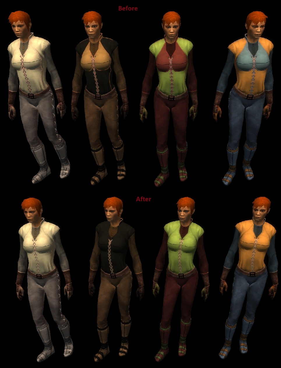 This is a small override, that replaces the basic female outfit (HHF_CL_Body01) with one that stops female characters looking like Harlequin. It is a simple fix, a change of tint-maps as well as retexturing the pink edges to be more neutral.