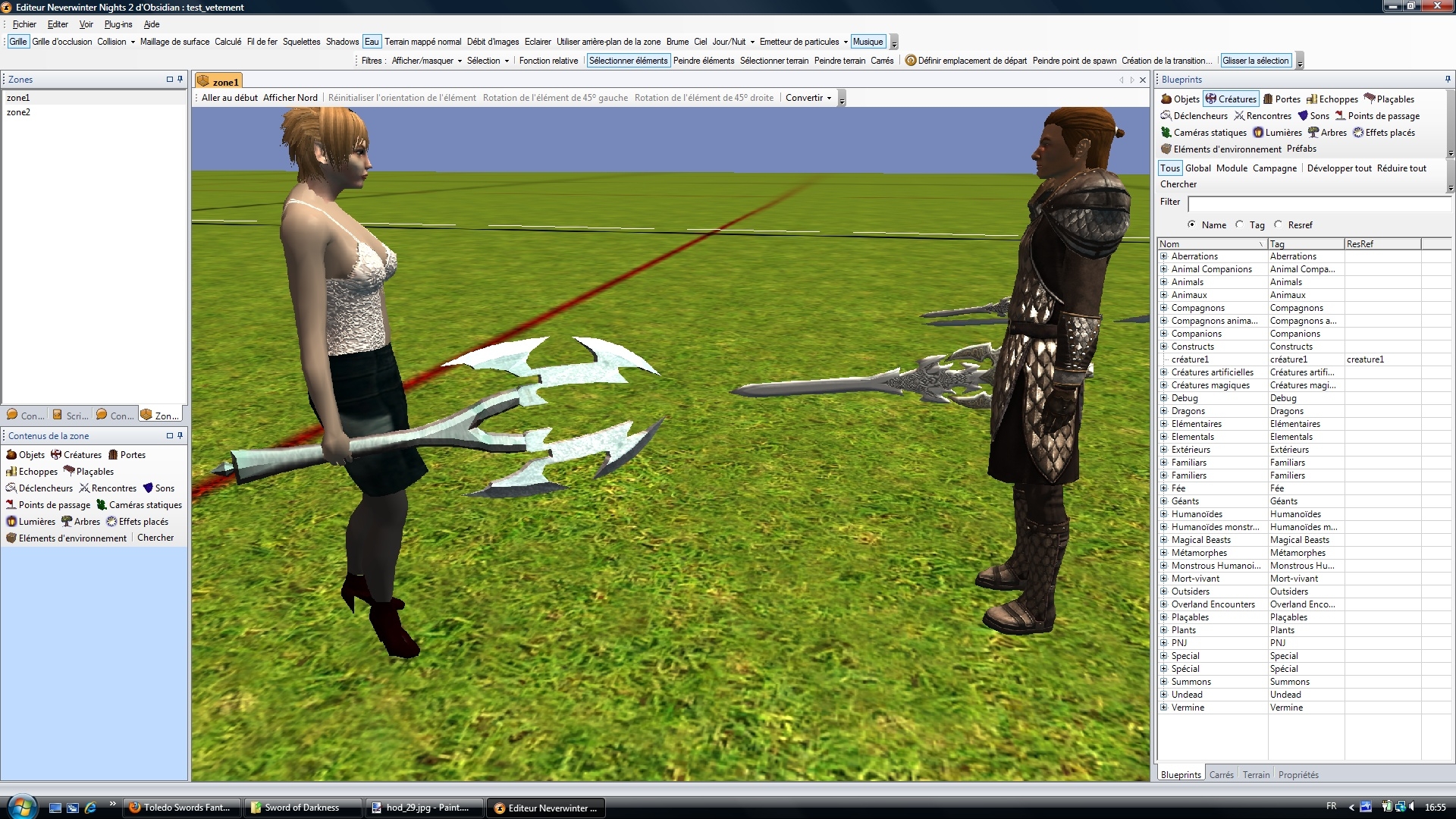 Pour les utiliser dans le toolset sélectionnez le modèle approprié (épée longue, à 2 mains ou courte, ou grande hache) et prenez pour la partie 1 le modèle 60 ou 61 (épées uniquement). Mettez 0 pour les parties 2 et 3. Vous pouvez aussi placer les fichiers UTI dans votre override.