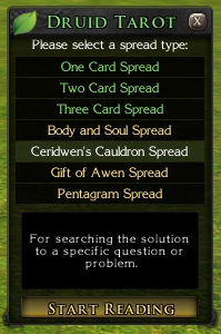 This download is for an interactive Druid Tarot deck/minigame. When you use the Tarot Deck item, it pops open a selection menu allowing you to choose from one of seven different card spreads.