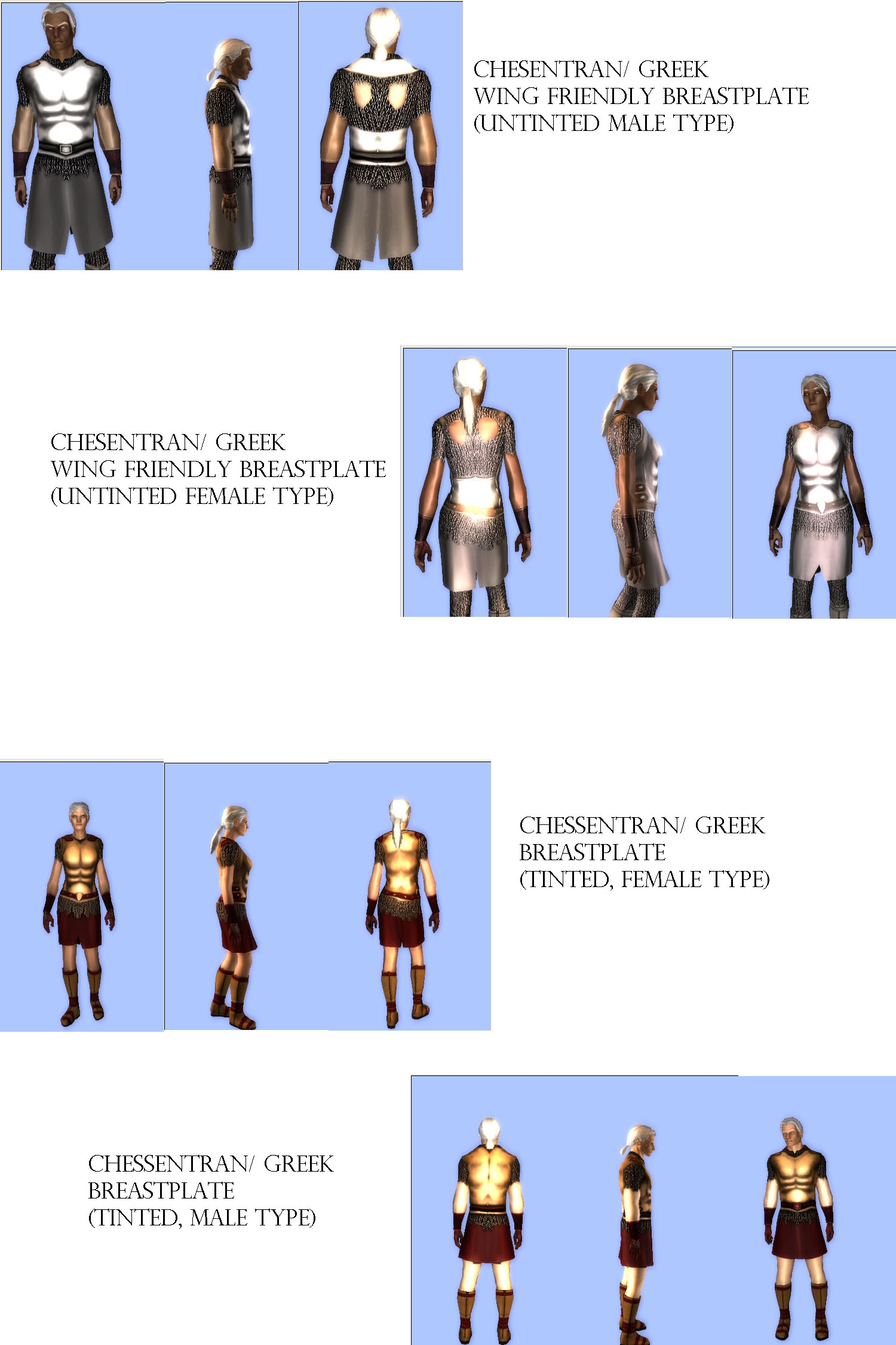 Chessentan/ Greek breastplate: As the name says. Best used with Shirtless Saga's and the Arcane Archer skirt accessories.
