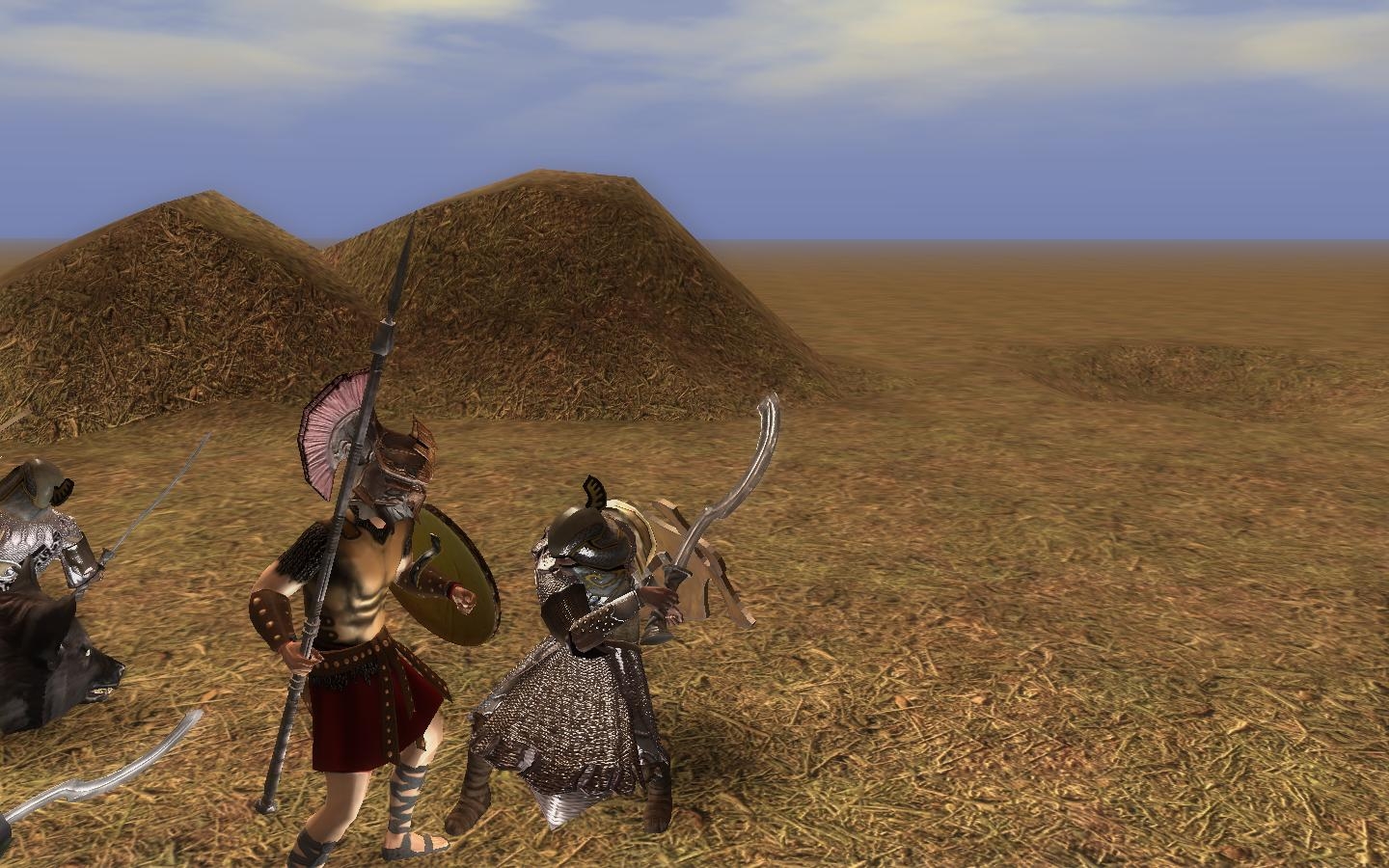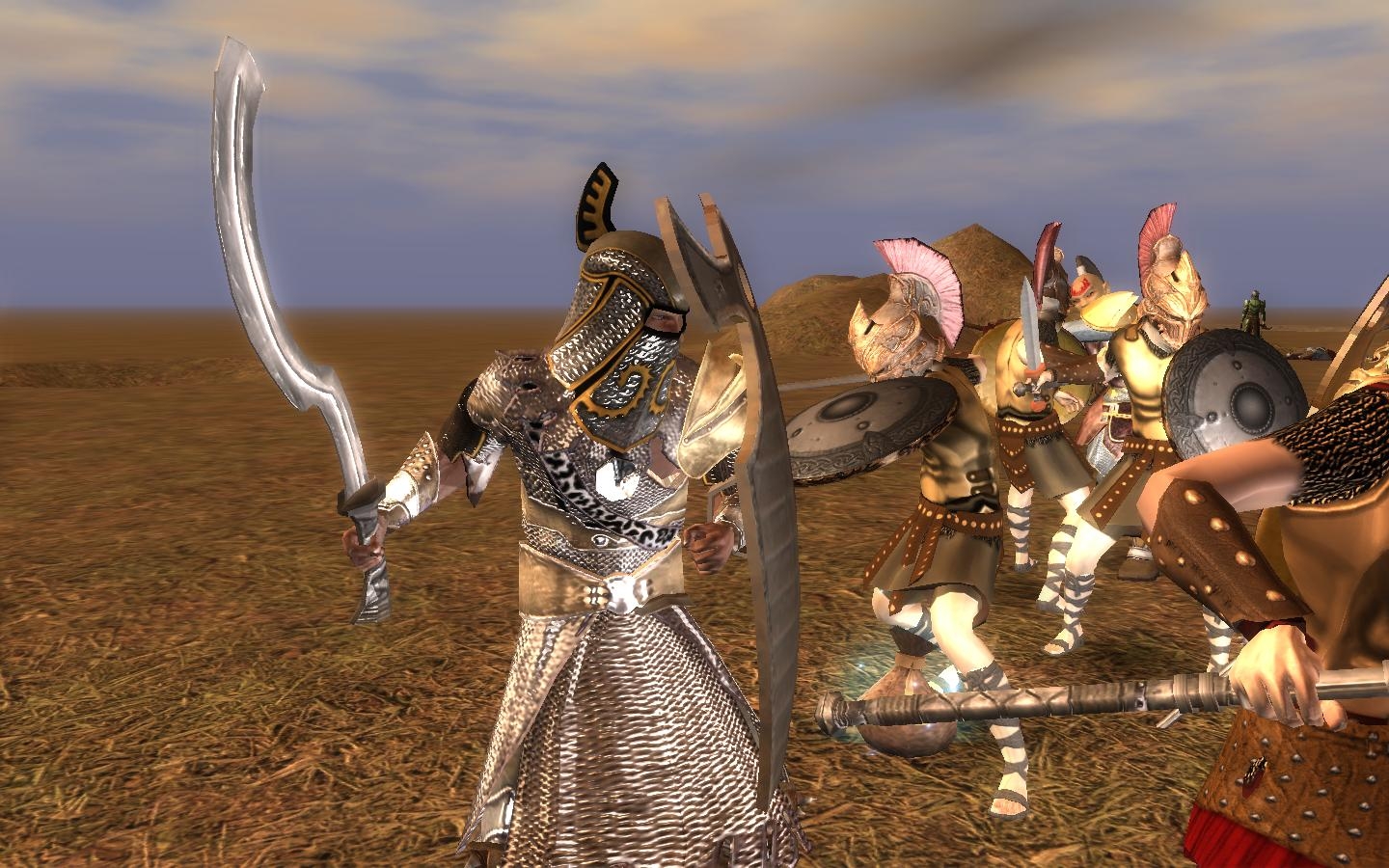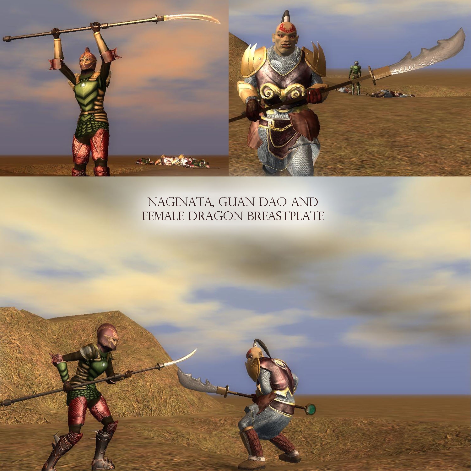 The screenshots use some material from other packs (weapons, helms, belts and accessories). Some have been tweaked but not uploaded (nor will they be till the original authors say their okay with it).