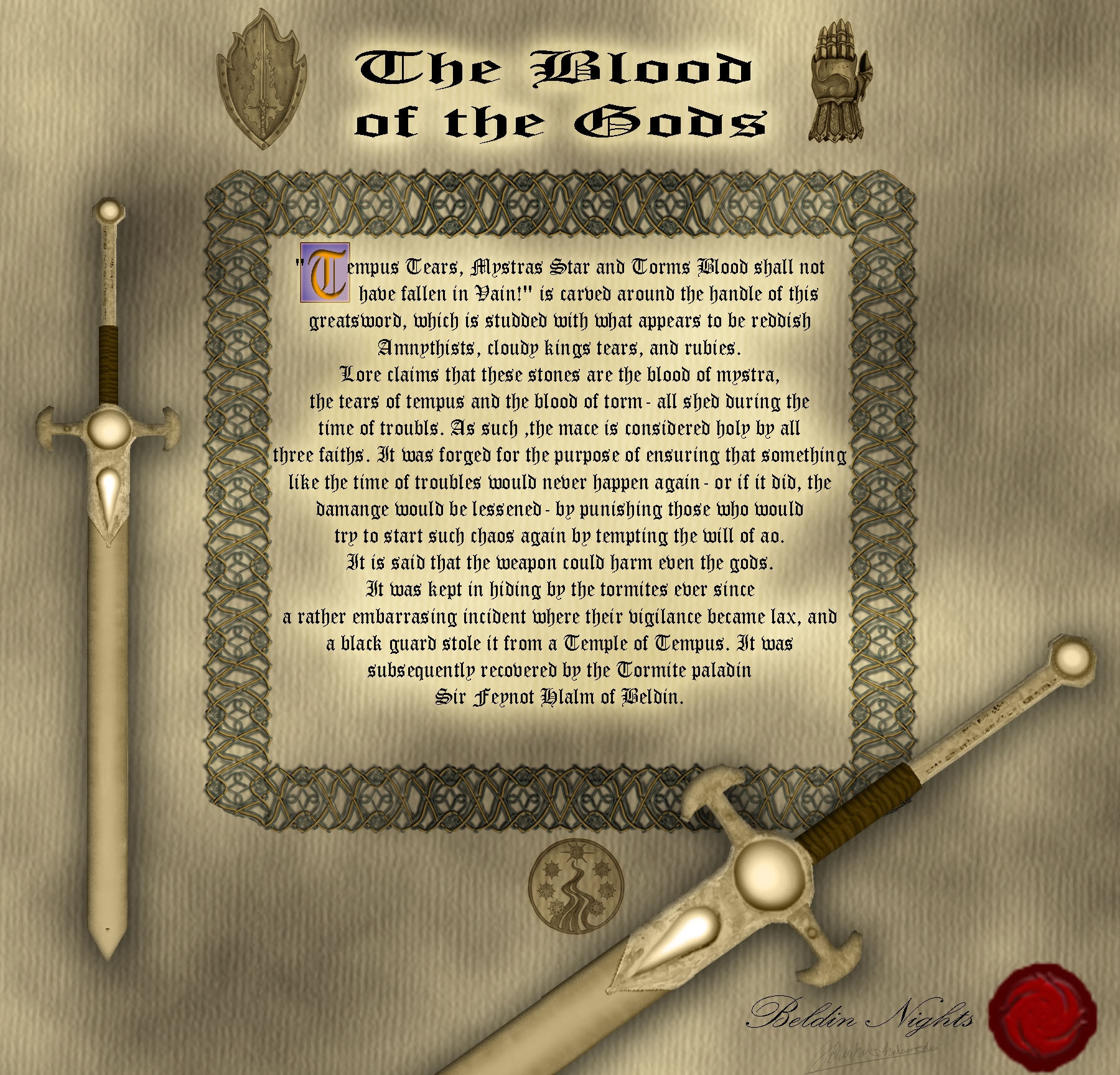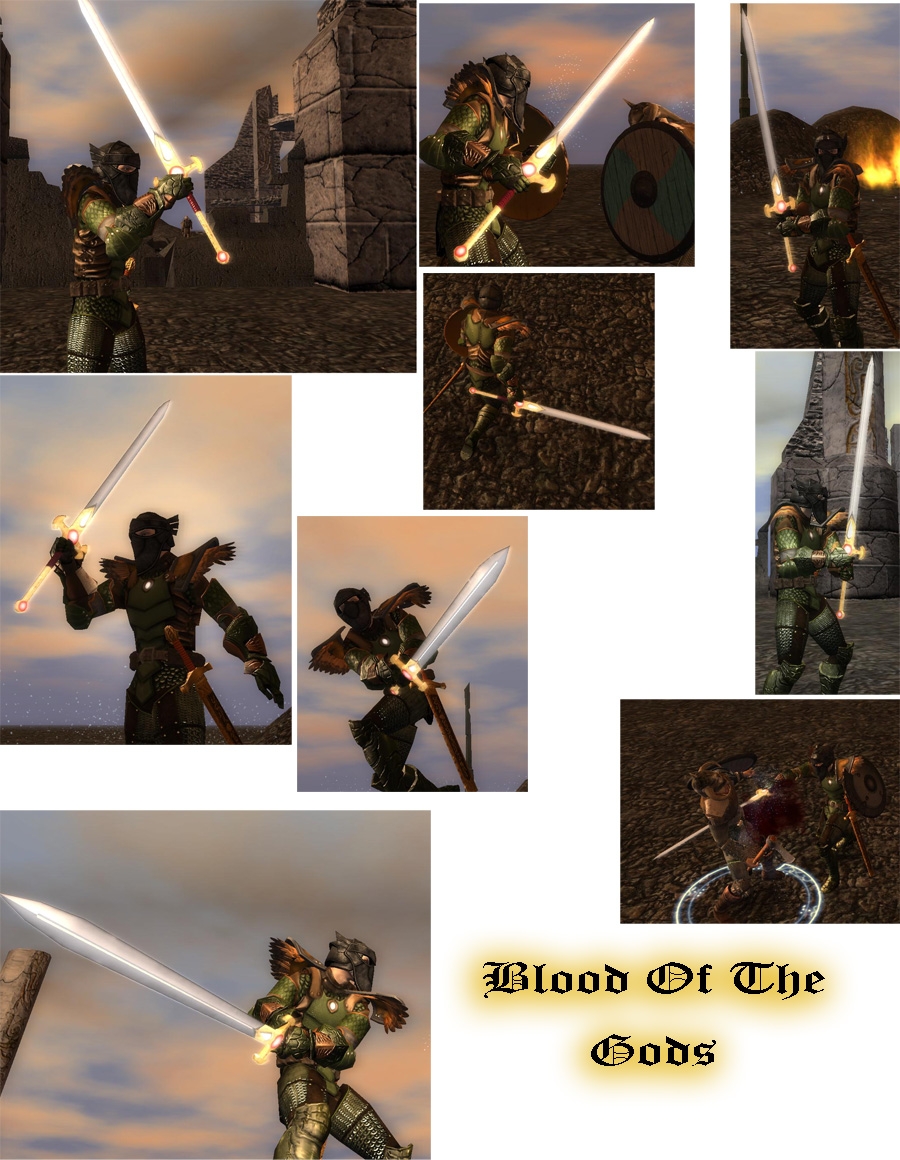 Blood of the Gods: Originally built specifically for Beldin. Its a glowing magic greatsword.