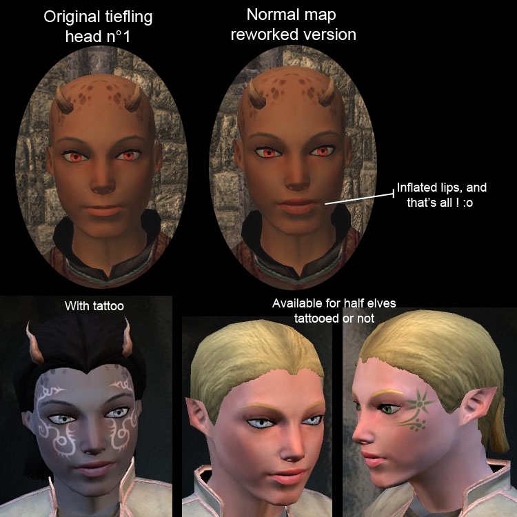 The rework of the tiefling head n°1 is available for half elves too. Each version got as usual, an optional tattoo.