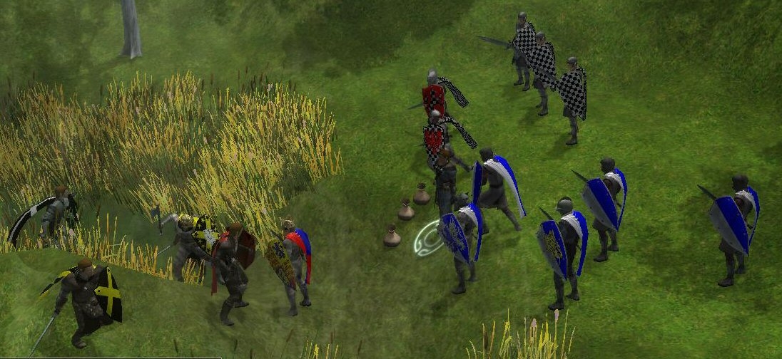 The King, Cassiadorus (Quartered, Red and Blue), with his bannermen Guy of Kent (Parti in Pile, Griffon Rampant CounterCharged) and Charles LeFrune (Checkered Black and White, Red Eagle Displayed) with their vassal knights Derrick the Swift (Parti in Pile, Gold Pegasus Rampant) and Lorraine the Just (Red, Checkered Fox Sinister Rampant) and their men at arms meet the cruel robber Baron Jax at The Whispering Ford.