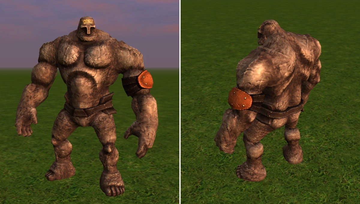 Hello, and here is my first custom creature model for NWN2, the Clay Golem. I started this guy all the way back in January of '07, and though he was conceived of as a quick creature project to get my feet wet, he's been shelved over and over again throughout, as I found myself unable to proceed or forced to shift my focus elsewhere. I first decided to create a Clay Golem because I felt it was a relatively 'safe' choice, and that an official version would not be soon forthcoming. Alas, Mask of the Betrayer is out and NWN2 fans are graced with an official Clay Golem model.