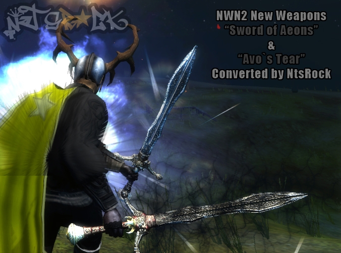 2 New sword models---"Sword of Aeons"&"Avo`s Tear". Original models and textures came from the game "Fable". They were edited improved and converted to NWN2 by NtsRock. 3mdl-3dds-1uti files in each sword pack. Check the Readme for installation details.