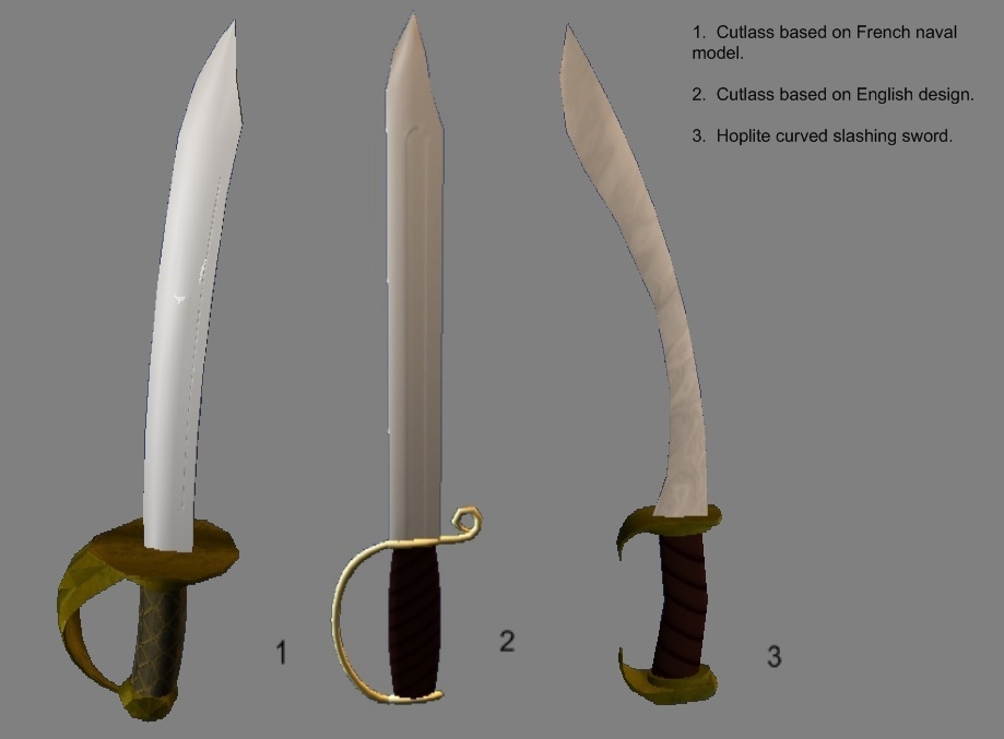 Four swords. Two cutlasses, one Greek Hoplite design (all replace the short sword blueprint), and one longsword. (Granted, the longsword doesn't really belong here, but I liked it.)