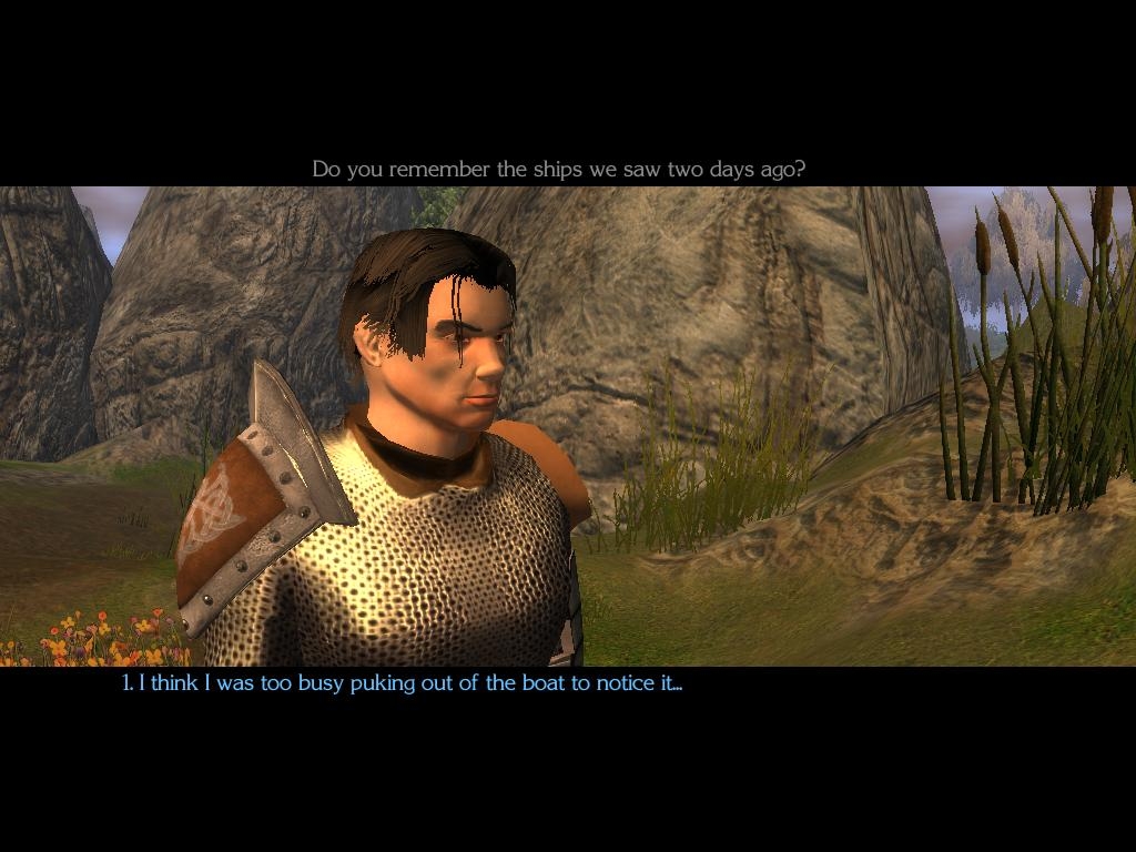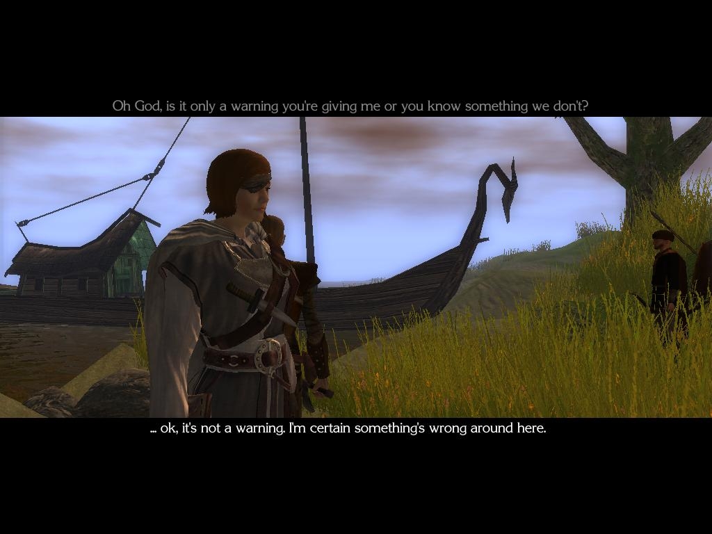And you really should do something about the generic names of the crew figures who don't come with you on the mission. I don't necessarily mean that you should give them all names, as they don't have any dialogue with you, but giving them a tag more distinctive than 'NorseGuardF' etc. would help. Even just 'Crew member' would be better than leaving them with the tags that Storyteller gave them. The captain, with whom you do have two long dialogues, is just tagged as 'human' and that really should be changed to 'Captain' (or her name, which I think cropped up in the opening conversation).