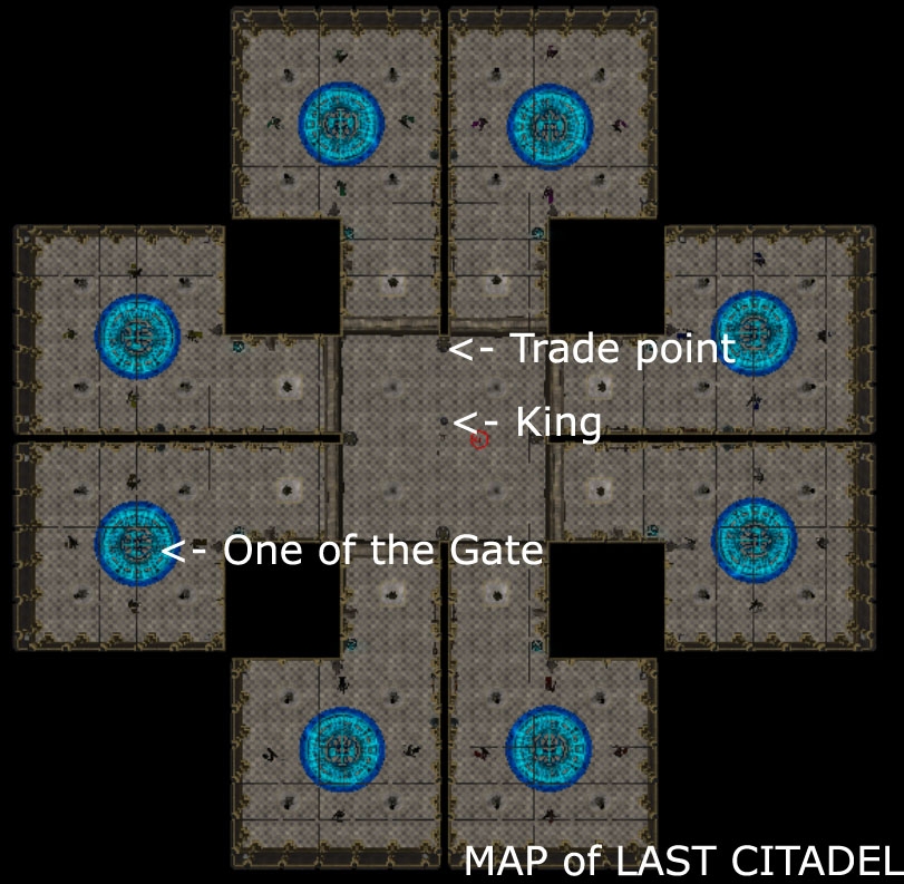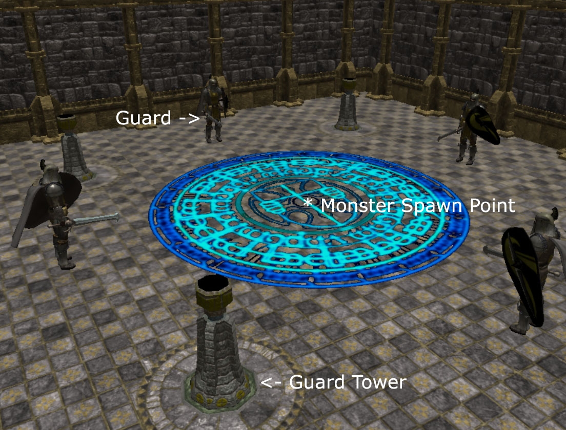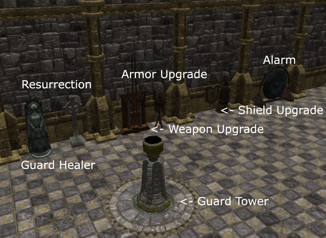 The mission of a PC is to protect the King as long as possible. There are several guards to help the PC (4 guards at each Gate). These guards can be upgraded (armor, weapon, shield), healed, resurrected. All this modifications cost GP and cristals. Having killed a monster, the PC gets XP and GP. Sometimes the monsters drop special items - modifications for the equipment, artefacts or cristals.