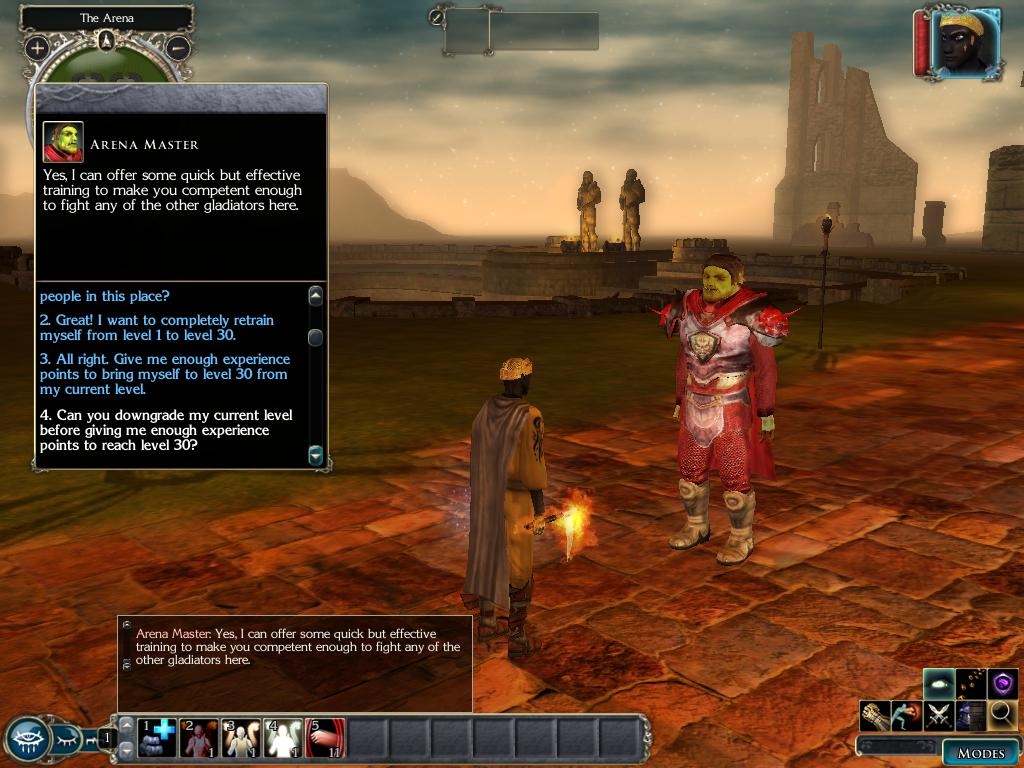 This is not an adventure module. There is only one NPC whom you may talk to, the Arena Master. At your command, he will arrange gladiatorial fights for you, give you experience points, and offer you the kind of gear that you may buy, loot, or craft in both the Original Campaign and Mask of the Betrayer. You may then pit your PC against any of the power builds to determine the PC's strengths and areas of improvement. The ultimate objective of this module is for you to test your character build concept against other epic builds or to test how these builds would fare against each other.