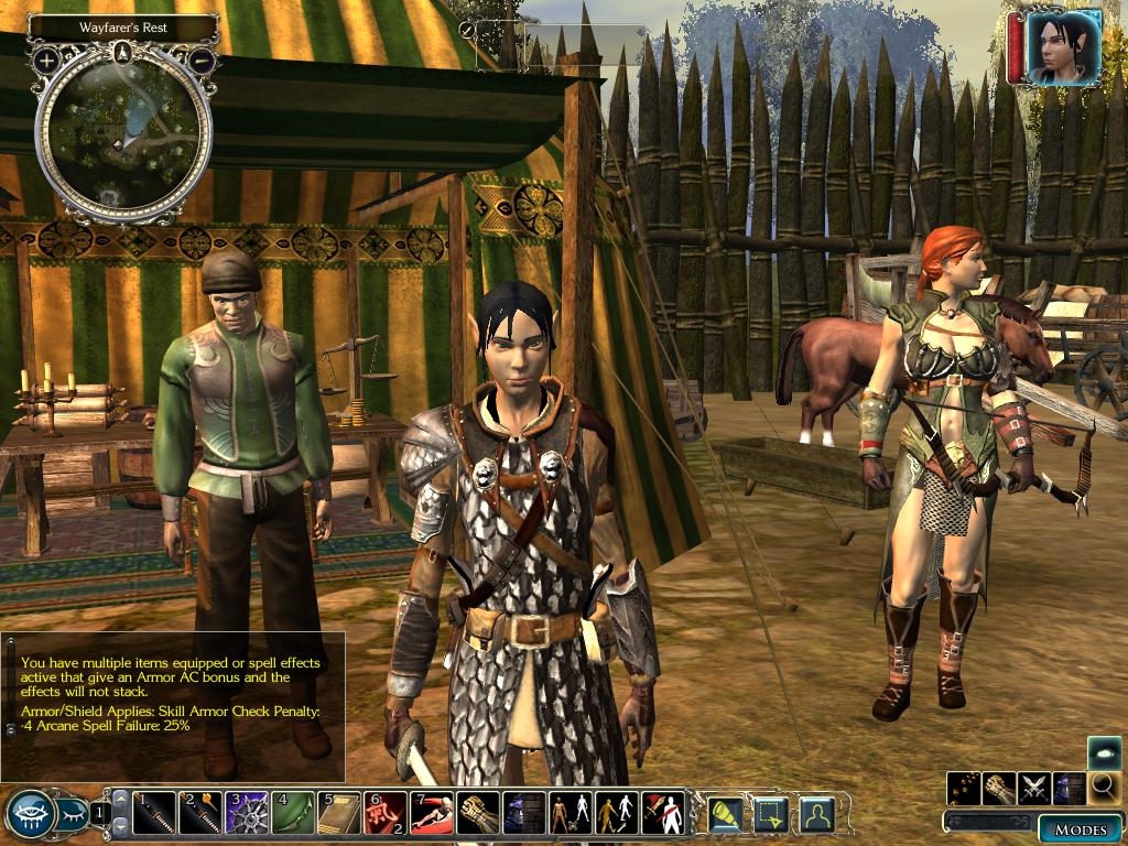 The addition of alternate armor designs is a great one limited only by the lack of the �tetris� style inventory of NWN1. With the one-square icons, you can�t see what you�re getting until it�s paid for. If the merchant buys the armor back at the same price, this wouldn�t be a problem (don�t know if he does � I forgot to check). The only way I can see around this is by having more people in the courtyard with each one wearing one of the armors (�Why, yes � I�m wearing chain shirt #3.�). That or using a character doll in a window with scroll arrows like that used by Charlie�s Item Appearance changer.