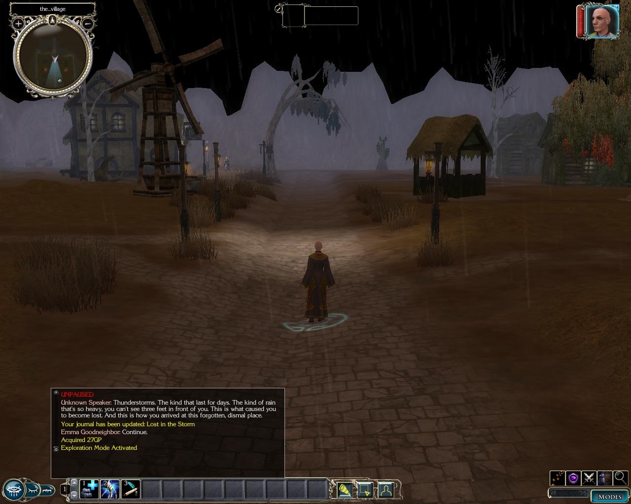 A terrible storm has devistated the caravan that you were traveling with. Somehow you discover a small, almost abandoned, trading outpost in the wilderness. Desperate for shelter, your approach is cautious. You notice soft candle lights flickering in the windows of one of the buildings. Hopefully, this will mean shelter.