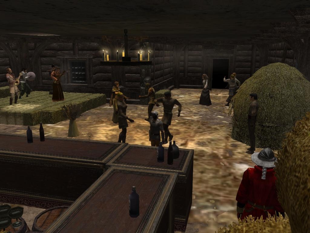 You had some interesting ideas for locations and the use of placeables. I liked the bar ... you might consider playing up the rustic and making the building an actual barn. As for the ship, I would suggest making all the objects broken and scattered around from having fallen to the "ceiling."