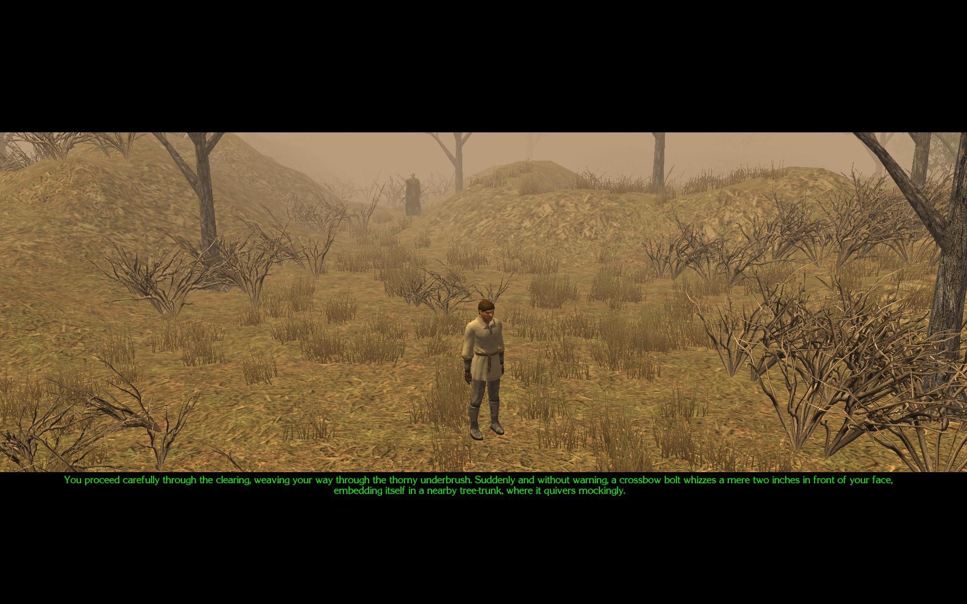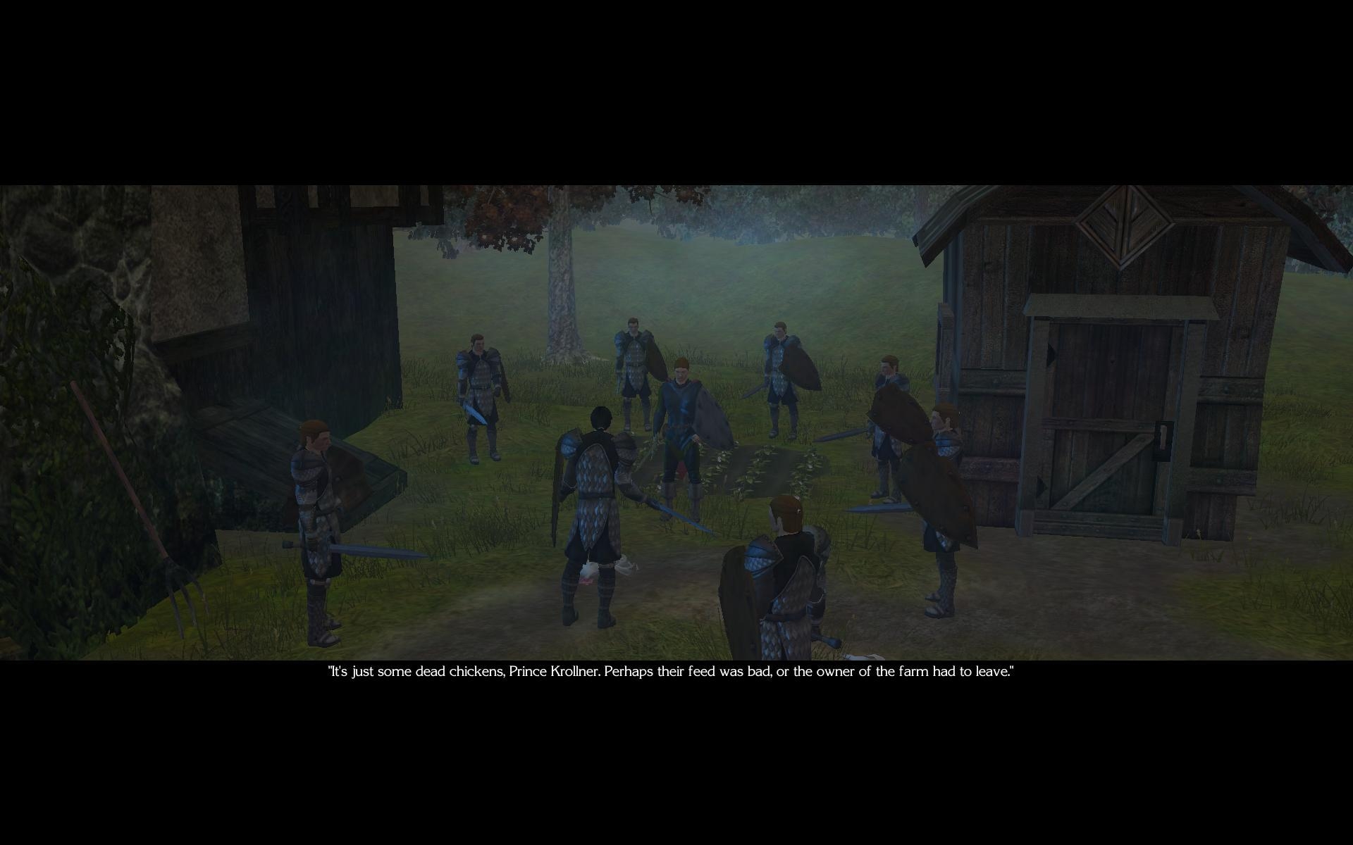 If, in "Klune Anor: South Gate," while escaping the city under siege, you experience any strange behavior -- ie., you don't see any NPC's, clicking on objects or to move does not seem to function, and/or your PC plays the running animation even when you stop navigating -- try saving and re-loading. Also, make sure your override is empty! ***