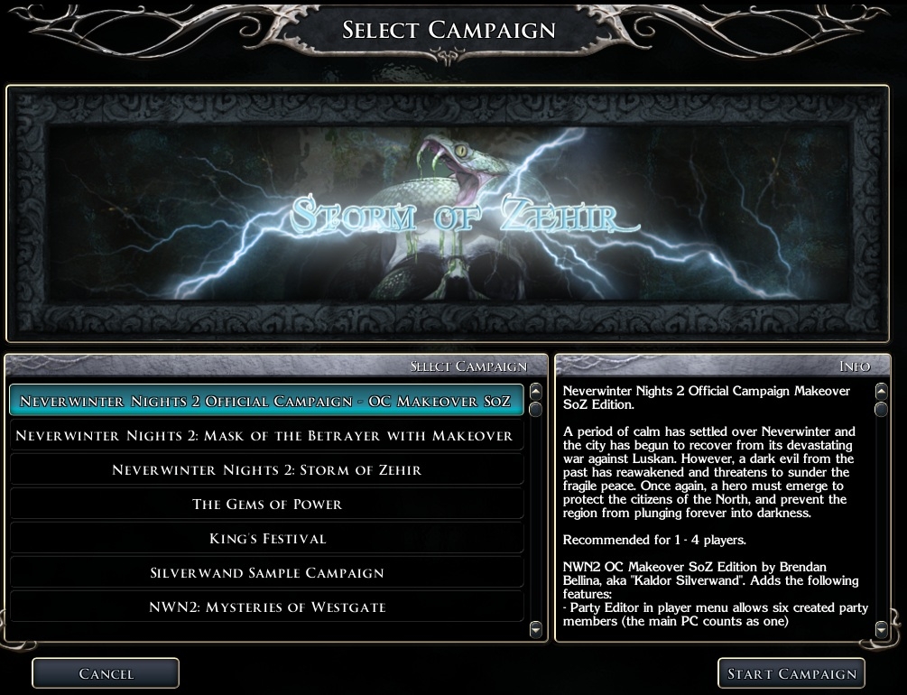 The NWN2 OC Makeover SoZ Edition is a collection of scripts, items, and UI modification that can be applied to the NWN2 Official Campaign in order to enable features of SoZ when playing the OC. This requires the NWN2 OC, MoTB expansion, and the SoZ expansion.