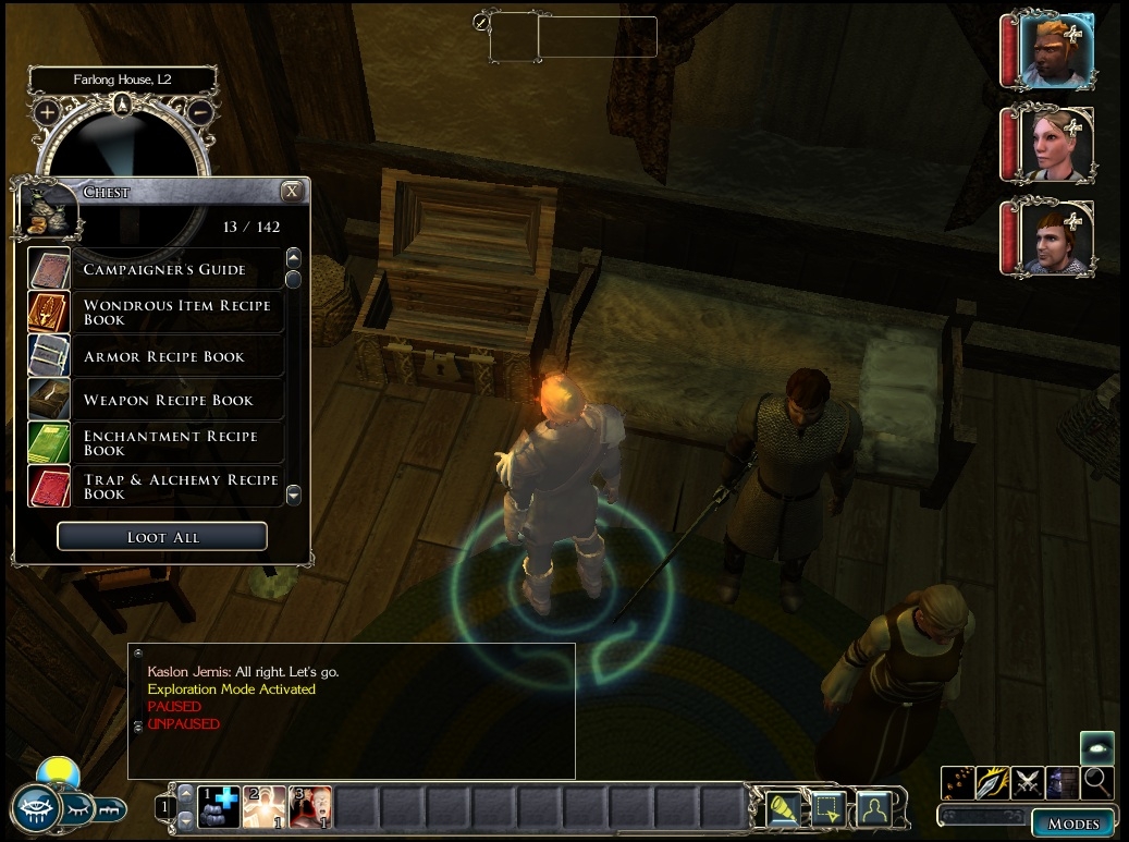 There is a chest for provisioning in the initial room at the start of Act I. The chest has been enhanced to include the recipe books, a Campaigners Guide that explains features of the Makeover, a few coins of life, and recognizes the player classes introduced in MoTB and SoZ. The chest will provide equipment when opened by the main PC and any created party members.