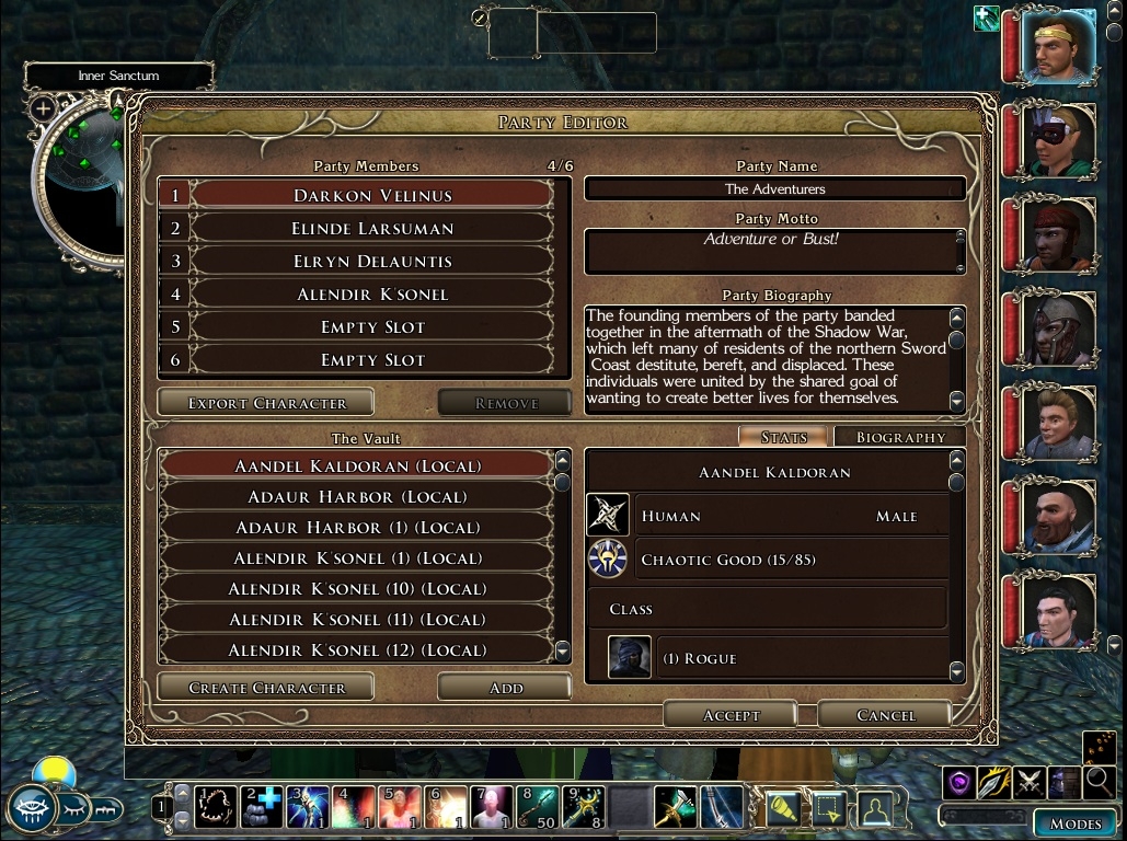 SoZ Party Creation is enabled. This allows up to 6 player created party members (one of which is the main PC) in addition to the standard OC companions. Party Members are created via the Party Editor option in the Player Menu. The Party Editor option can be accessed at any time. This is comparable to the guestbooks used in SoZ.