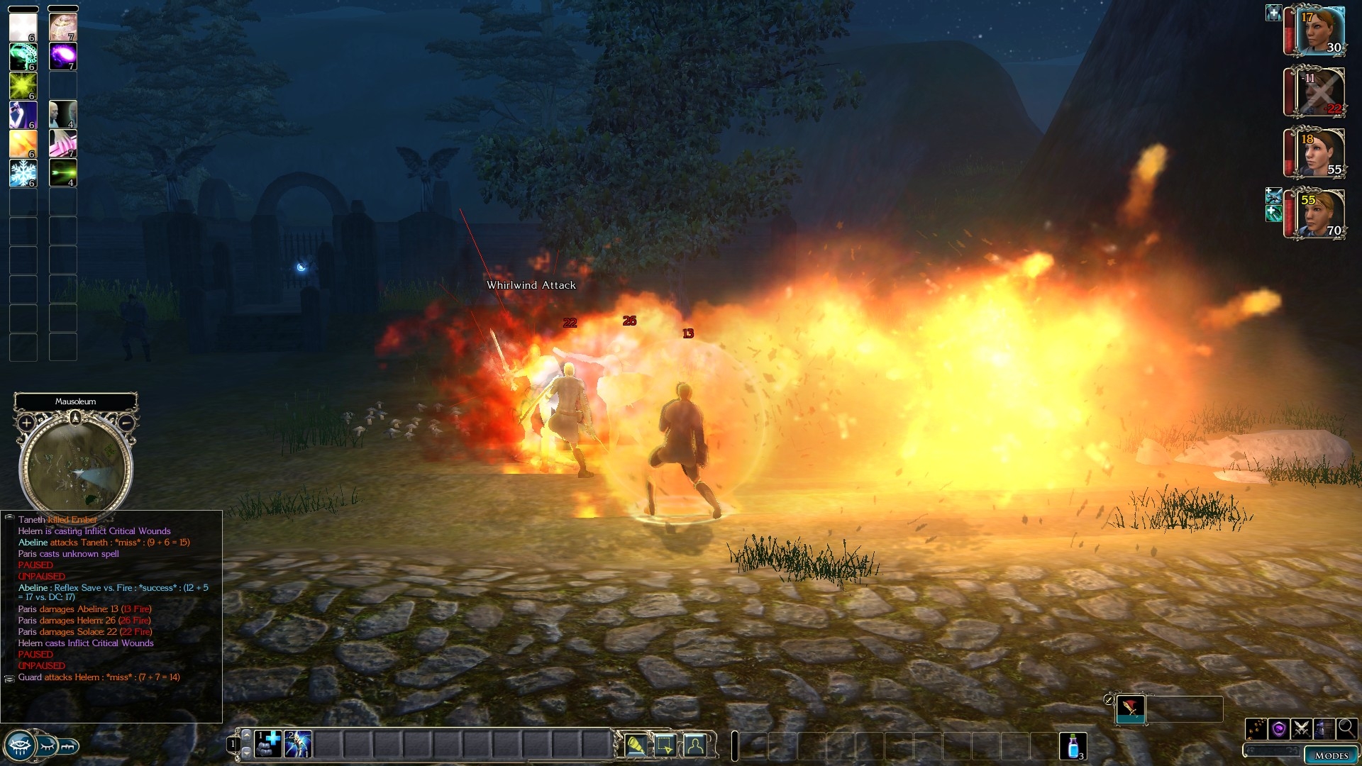 For the final battle, I think it might have been better for the bald woman to say "be there at dawn" rather than "in an hour." With only an hour, I didn't rest and hence didn't get new spells for Hemen, and since her stock spells were kind of poorly chosen, the climax battle was brutal -- my Swashbuckler/rogue ended up doing a lot of running around getting chased as the other characters regenerated from death to pop up for a few seconds, shoot some arrows at Tanath, and then get killed again. Eventually I wore him down though. This leads me to another suggestion though -- I think the SOZ death system is more realistic and would be better for the modules.