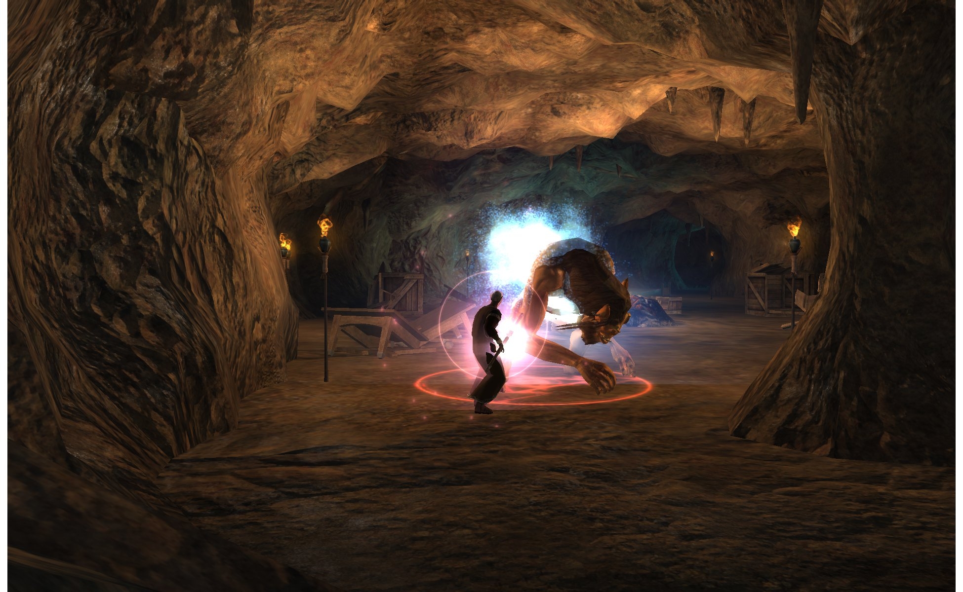 The riverwizard island was a bit tough though, even when I got the level-2-spells I would usually aggro the wolves+goblins, then run back to the boat, cast all the spells and then vamoose to rest (rinse and repeat). Even with the Winding River staff, I needed the same approach for the beetle mound: Aggro a beetle, run back to entrance, kill one or two beetles, then go to surface and rest.