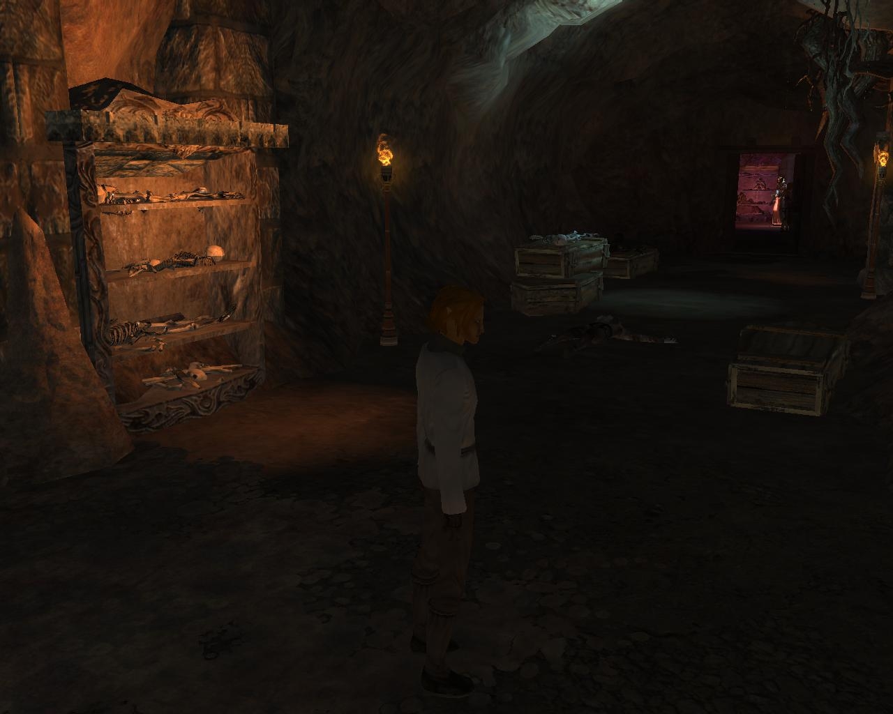 In the cave no bad guy was to be found. Eventually I smashed the coffin to see if anything would happen. And the exit wouldn't let me out so I had to use the debug note--which ended any future events from there. Actually, I must say the only thing I really didn't like--which I hate in any module--is being trapped in unrealistically by simple programming. It happens twice in this mod. What old-school PnP modules did that? It at least has to have a viable explanation. And of course it can lead to a bad end--either with a bug or getting killed with no escape, when there really should be one. The cave instantly collapses behind you when you enter?