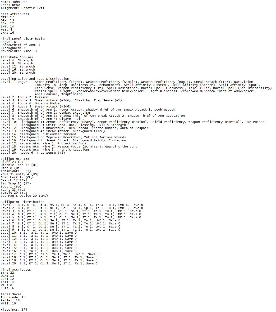 1. Alter his level and alignment. The character is given the ability to raise and lower his level. The character can also change his alignment at any level and the "Neverwinter Nine" and "Shadowthief of Amn" epithet feats have been added. Hence, any class combination supported by the game engine can be created. There is also an option to write a character's level progression including feats chosen, skills taken and attributes increased to the log file, so that the character can be recreated on a PW or another server vault scenario.