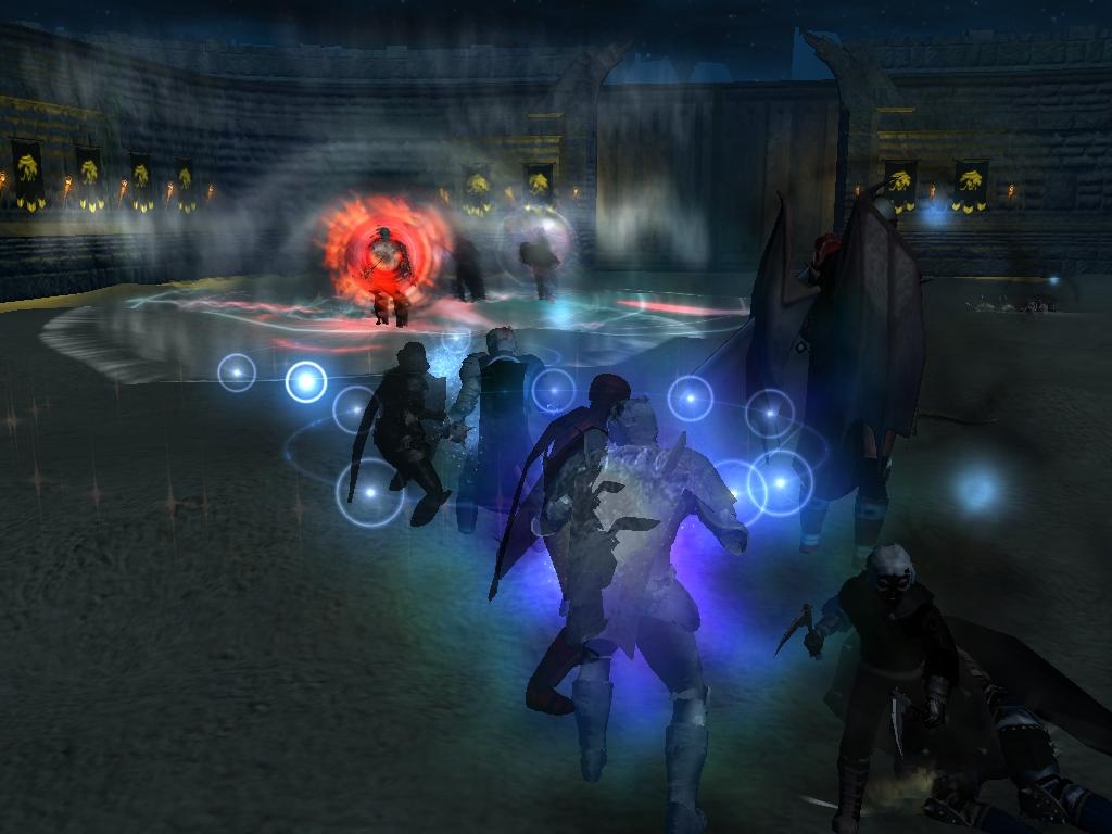 3. Test his battle prowess. The character can test himself, alone or with one to five henchmen, in combat against one to six opponents at a time in any one of multiple arenas. The opponents are divided into monstrous opponents and PC builds. The PC builds have custom AI scripts, which simulate the behavior of a human player better than the default AI and should give the player an inclination of how his character would perform in a player vs. player environment. The enemies can have their gear customized; i.e. changing the enhancement level of weapons, armor, etc. Hence, characters can be tested against the type of opponents they would face in low magic and high magic settings. The AI can also be adjusted so that it will or will not use knockdown and will or will not buff itself before combat. In addition to the default PC builds within the module, a database has been added that allows the player to fight against up to 10 of his own builds. The arenas are varied, ranging from a deserted coliseum, to a volcano with damaging environmental effects, to a constricted dungeon with randomly opening and closing gates. They are designed to take into account the effects that environment can have on the combat capabilities of a character.