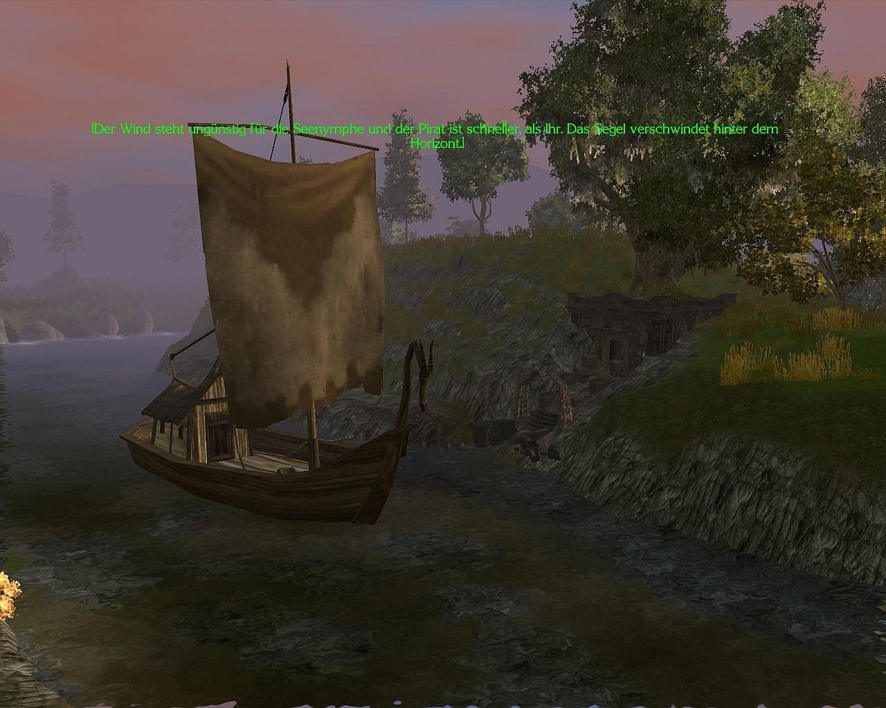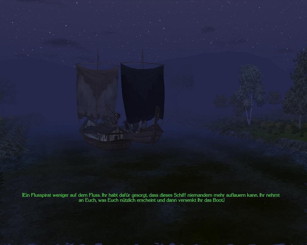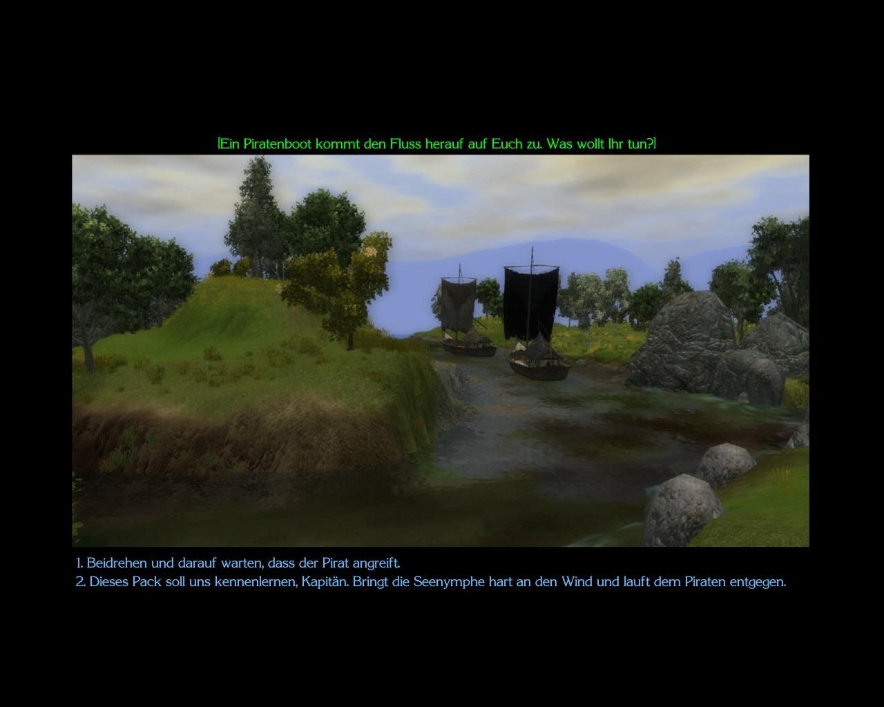 Unterwegs auf dem Fluss läuft eines Nachts ein mysteriöses Schiff mit einem schwarzen Segel an deiner Seenymphe vorbei. Und du erfährst, dass es sich bei diesem Schiff wohl um einen Flusspiraten handeln dürfte. Deswegen beschliesst du, die Mannschaft der Seenymphe mit vernünftiger Ausrüstung zu versorgen und legst dazu bei einem kleinen Handelsposten an. Das erste Kapitel des dritten Teils wird ausschliesslich im Umfeld dieses Handelspostens spielen.