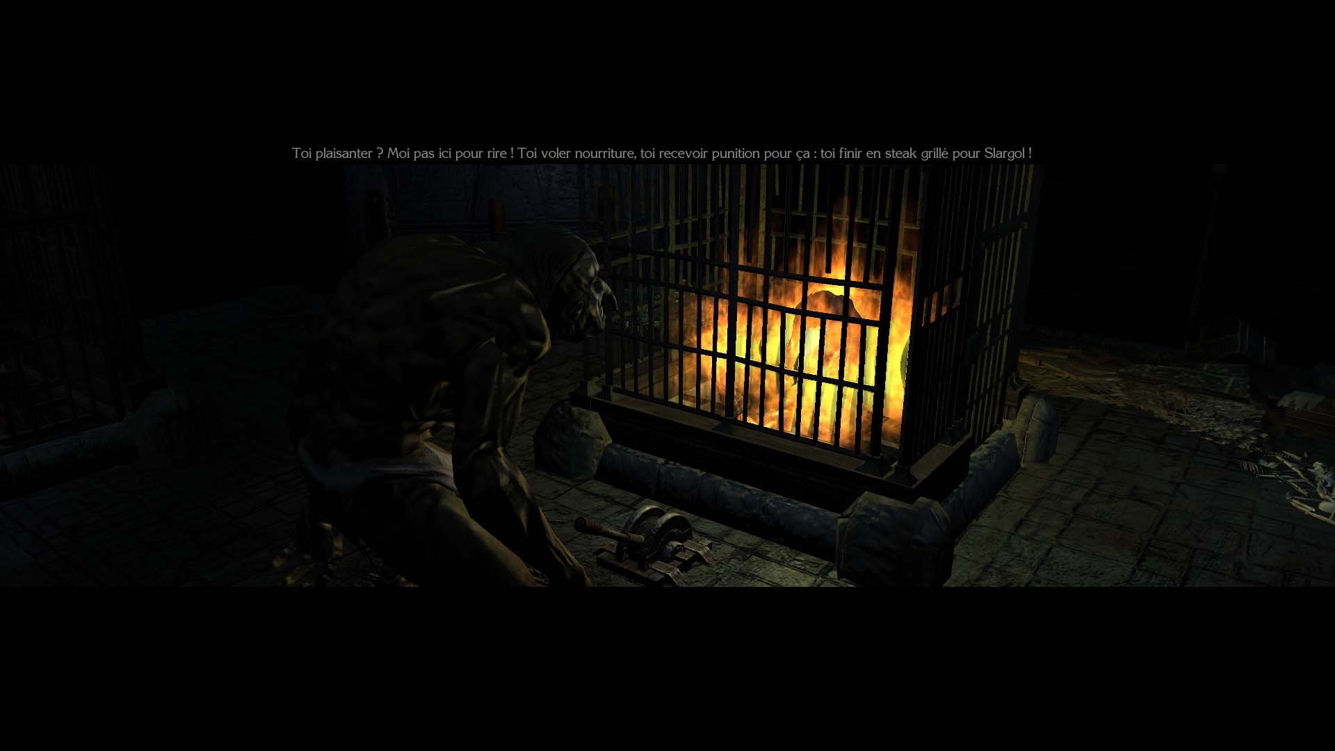 Alors pour la cinématique d'intro, il s'agit d'un mauvais rêve que le héros fait lorsqu'il est endormi dans le camp des chasseurs. Il voit son ancienne amie Bouche dorée, qui apparaît dans les deux premiers modules... et puis tout dérape, celle-ci se transforme en vampire. Je l'ai conçu comme une sorte d'avertissement lancé par le vampire qui règne sur les Terres maudites : il attaque le héros dans ses rêves, en le prévenant qu'il allait bientôt avoir affaire à lui...