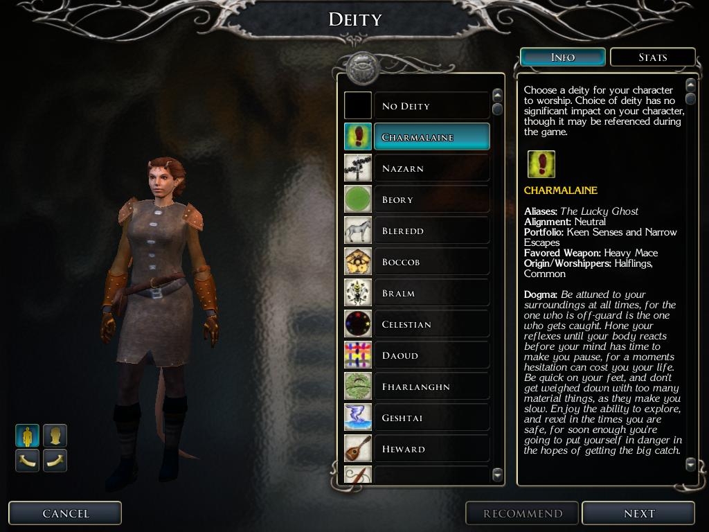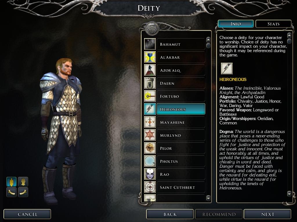For those interested in the Greyhawk Pantheon. This turns off the Faerun Deities and adds Greyhawk deities to the game. Includes the deity icons, origin/worshippers and dogma (shown during Character creation).