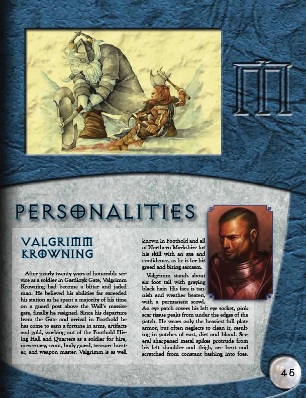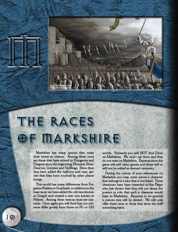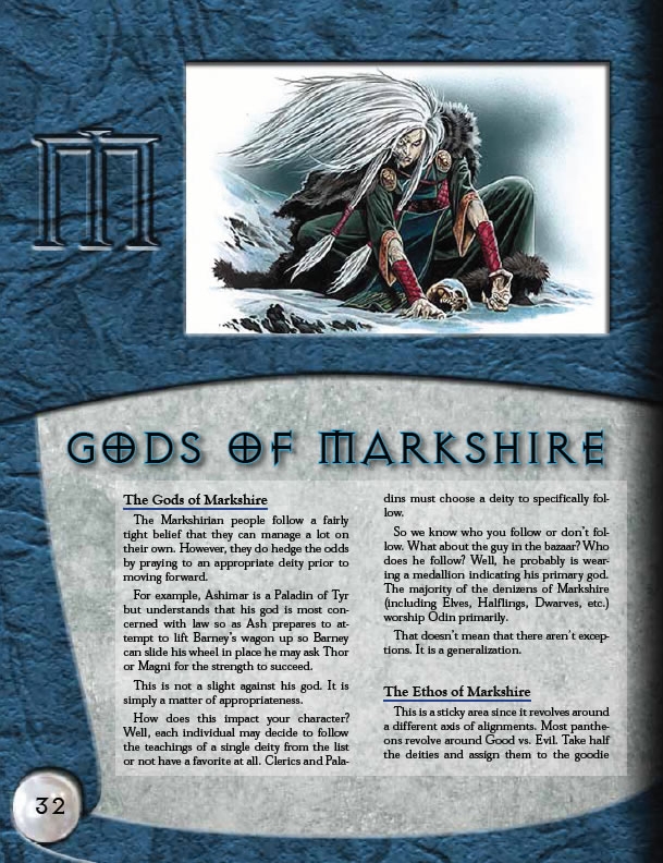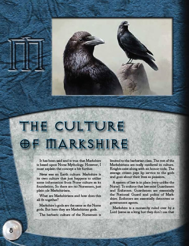 This stunning full-color PDF contains information on the classes, races, and mythology of Markshire in order to round out your character. In its pages are also bits of history, lore and the geography of this 25-year-old custom Dungeons & Dragons campaign world.