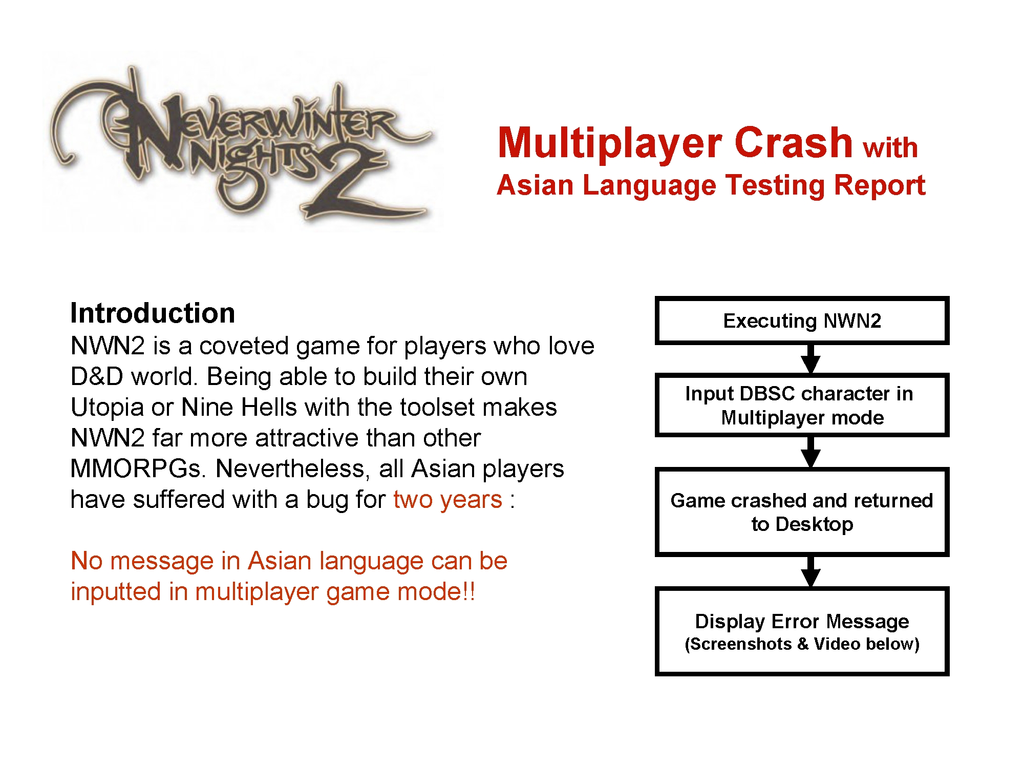 NWN2 is a coveted game for players who love D&D world. Being able to build their own Utopia or Nine Hells with the toolset makes NWN2 far more attractive than other MMORPGs. Nevertheless, all Asian players have suffered with a bug for two years :