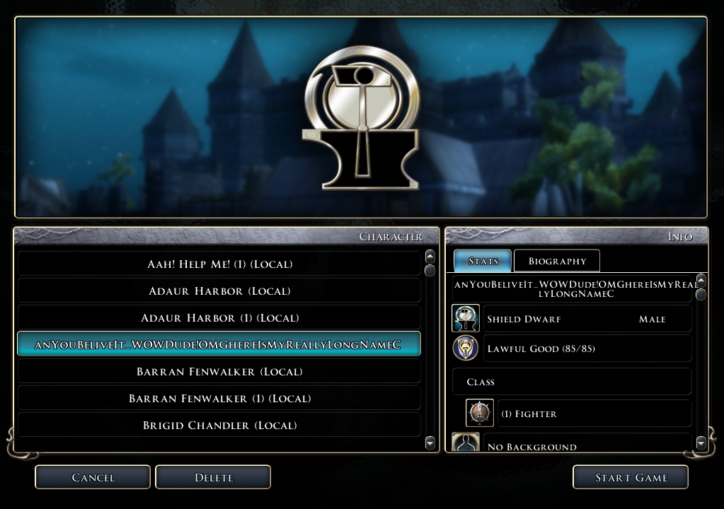 Give your character a name with up to 108 letters or punctuations (great for guild titles)! This override modification increases the length of the First and Last name fields from 15 characters to 54 characters each.