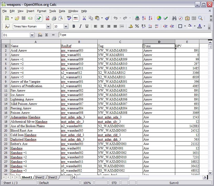 Yo McGavin, good job, although if you sent me an email culpa,[email protected] i; will return the complete set armor weapons and misc in an excell spreadsheet that you can upload for folks who dont have OO.o installed ;) _________________________ Mea Culpa's Demesne