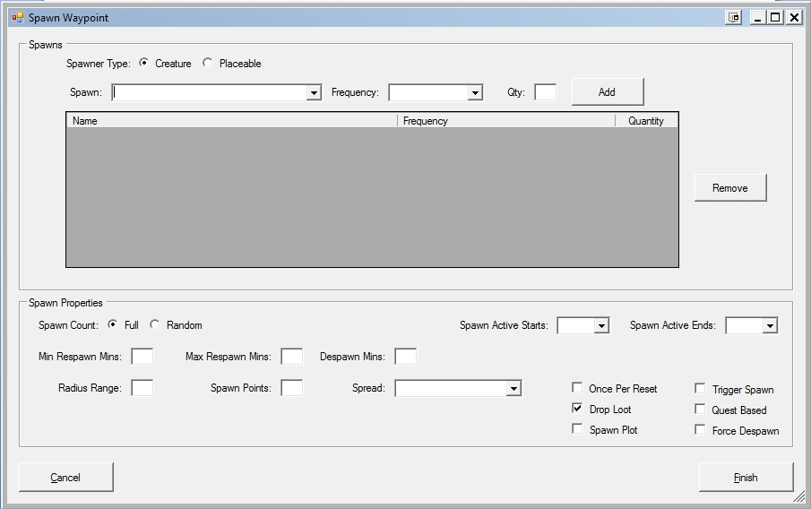 The Spawn Plugin has been streamlined to be as efficient as possible so it is helpful to know that if there are no players in the area, there are no objects, monsters or NPC�s in the area either. As players come and go, these items will spawn and de-spawn as needed on their regular schedules without complex timers, area heartbeats or delay commands.