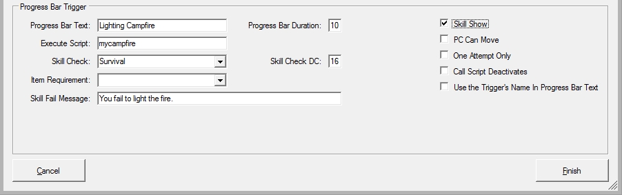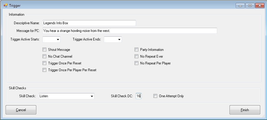 Sometimes, communicating important events or notable activities in Neverwinter Nights 2 Chat box is just not enough to let your adventurers know they've noticed or accomplished something. Even the Floaty Text above their heads can sometimes be missed. This Legends Plugin helps with this issue. Having trouble making small camera cut scenes to help relay information to adventurers about their surroundings? Perhaps you are looking to make more use out of character skills like Survival, Search and more. All of these can be accomplished with this plugin. Leveraged by several other Legends Plugins, the Info scripts are simply some customized GUI screens and code that allow you to display various activities on the screen as well as offering the ability to have adventurers perform time sinks when doing various tasks including support for skill checking. There are four main features of the Info Plugin; the first being a nice display of custom text that can appear on your adventurer�s screen, bright, big and noticeable. The second is a progress meter that can be applied to almost any activity from searching for things to using objects with optional skill check, the third is the ability to make simple trigger based cut-scenes and the fourth offers you the ability to create town criers to share any information with nearby players that you desire live (such as when the Goblin Chief is killed or when the town vaults have been looted!)