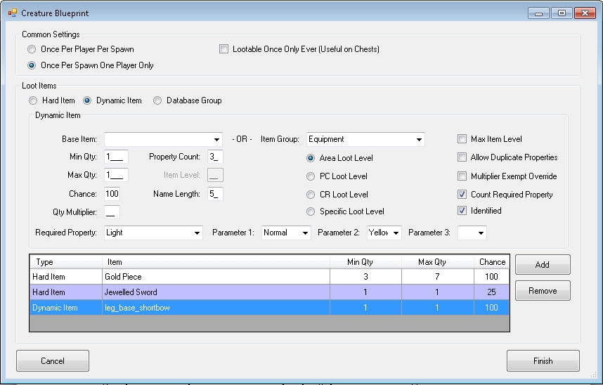 The plugin included in this package makes it simpler for Neverwinter Nights Persistent World builders to offer its hearty adventurers an interesting and easy to use method for creating and distributing treasures! Have you ever wanted to offer unique treasures with interesting names without the need for thousands of item blueprints? How about random treasure tables? Perhaps you'd like to use a small set of chest blueprints spawn all sorts of different items? This package will allow you to do all of this and much more.