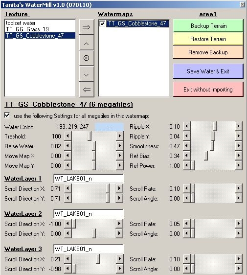 both ways will remove all other water, that is: you have to store _all_ water as watermaps, even the "normal" toolset water. (this is because there is no way to tell which chunks of water in a map where actually created by toolset or watermill) _________________________ TerraCoppa, WaterMill, NWN2Packer & Packistani, WorldGate, RRN-Docs, RePlug... PW Weltentor (german)