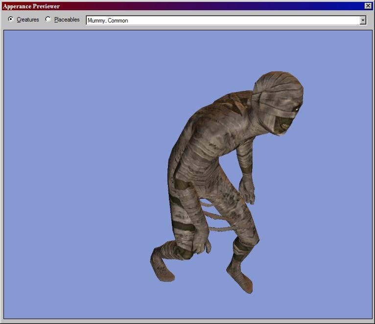 This simple plugin is just a convenience tool that allows you to quickly preview appearances of creatures and placeables. The preview window controls are the same as they are elsewhere in the toolset.