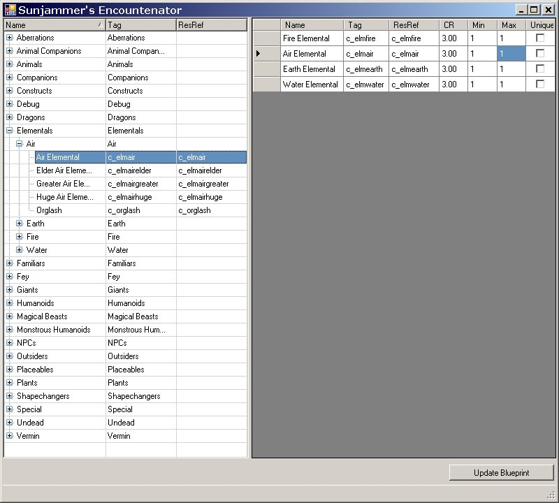 Been using this since early testing - it makes encounters sane. (Yay! No more having to scroll through creature resrefs alphabetically...) _________________________ The Grinning Fool The World of Khalidine, a unique RP PW.