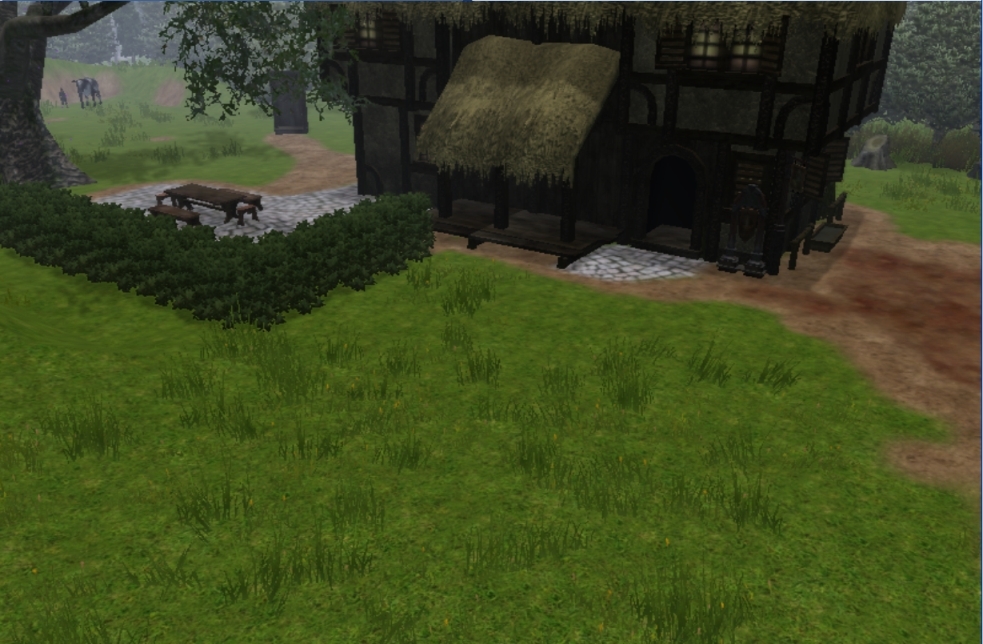 On the grass, mix up the grass around the inn as to length and density just like you use texture. Different types and perhaps little patches of wildflowers might look good too.