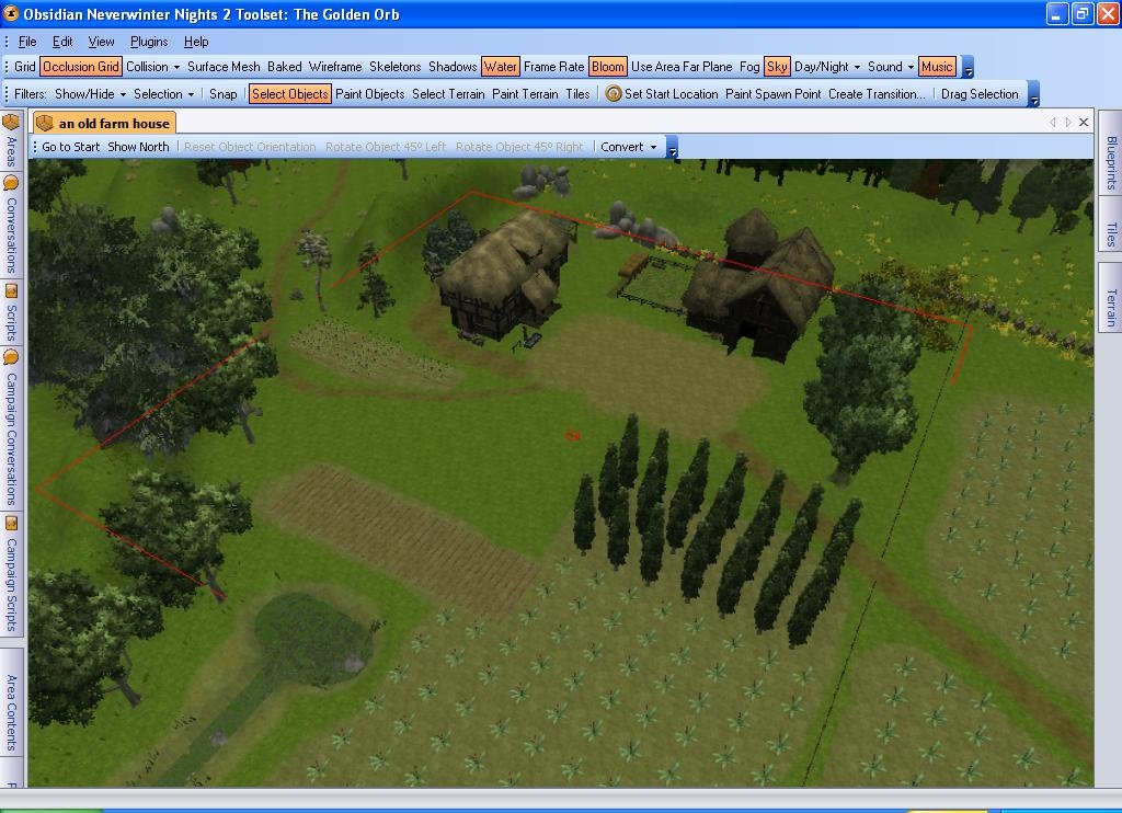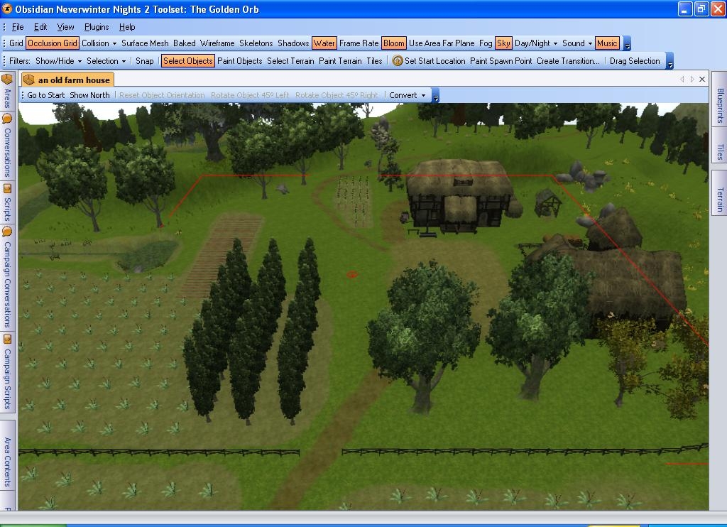 An Old Farmstead - This is a small 8x8 rural exterior. There is a farmhouse, a barn, and some equipment and such around the buildings. There are several fields with fences and a stump wall separating several of them. There are trees and grasses, though I tried not to go overboard. A steam runs through, but with a small irigation type line, it is outside the walkable area. This is the second area I have completed for a module I am working on, and it has some improvements over the previous pre-fab that I put up.