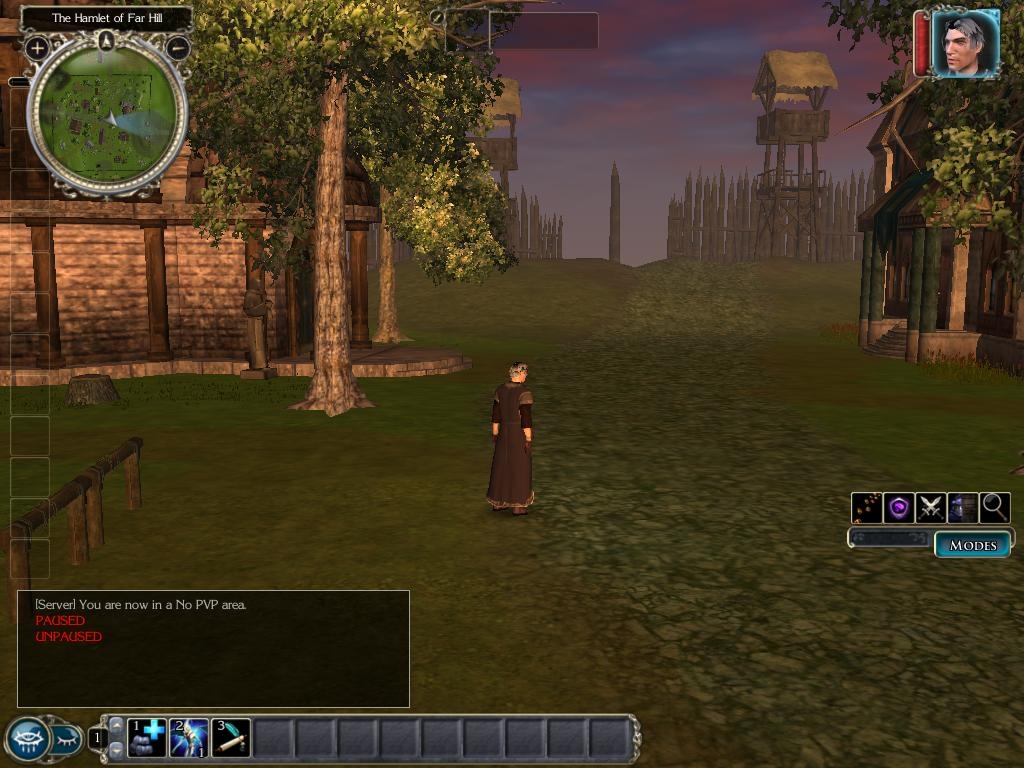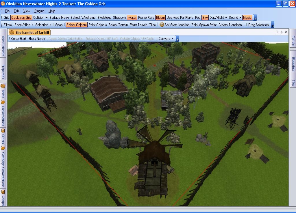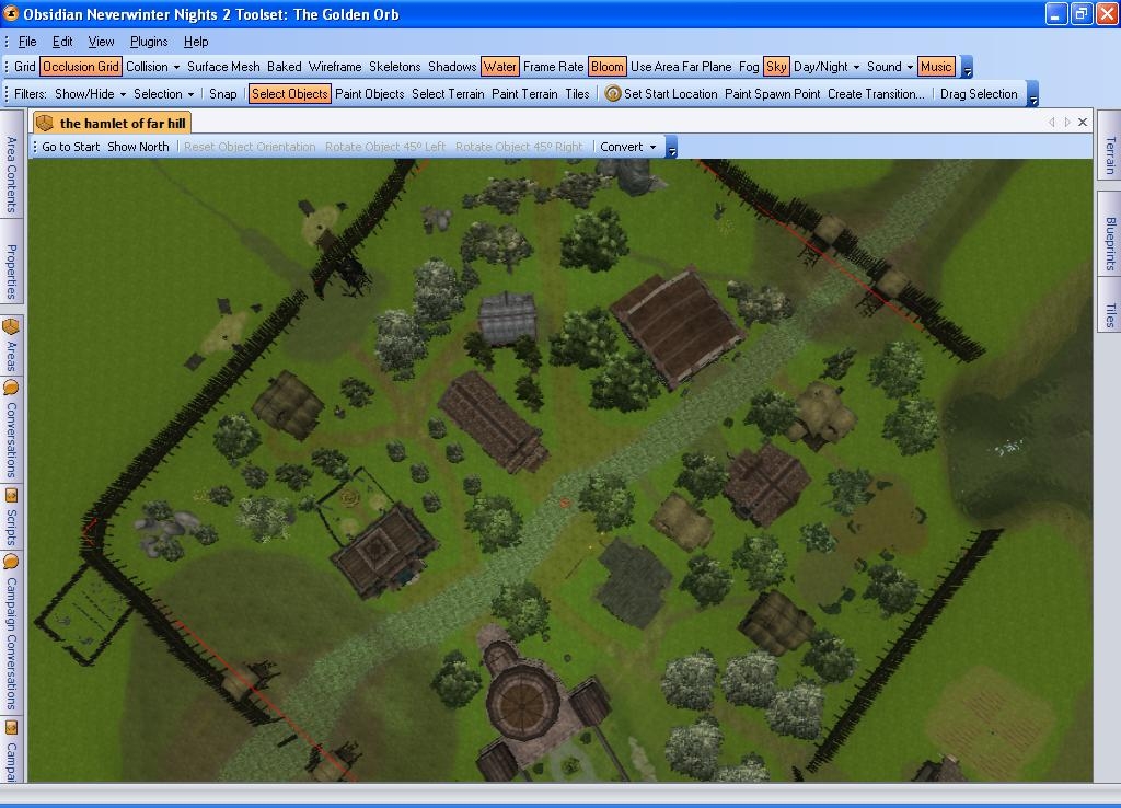 This is the starter village from the module that I am creating. This frontier village/hamlet is surrounded by a pallisade wall. The main entrances have guard towers, and a road runs through the entire scene. There are a smattering of buildings, the edges of a lake, and several unreachable set dressings beyond the walkable area. There is an inn, a smithy, a temple, and merchant shop. As well as guards quarters, a windmill on a hill, and some odd warehouses and homes. I have placed a few sounds, but they are basic background noises at best. There are no interiors included. There is a fair amount of grass, as well as trees within the walls and without. This is the first Village type area that I have submitted, so any and all feedback is very welcomed!