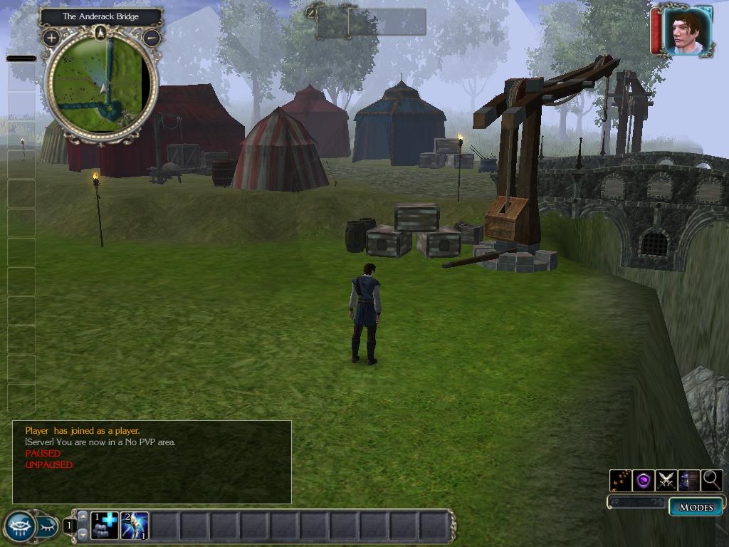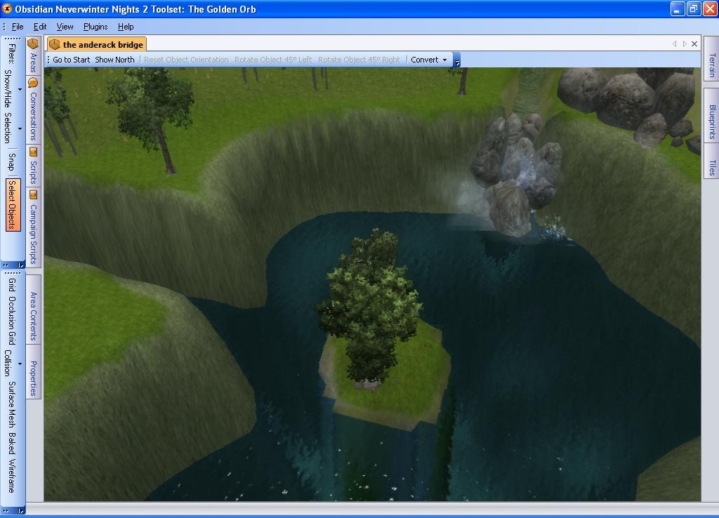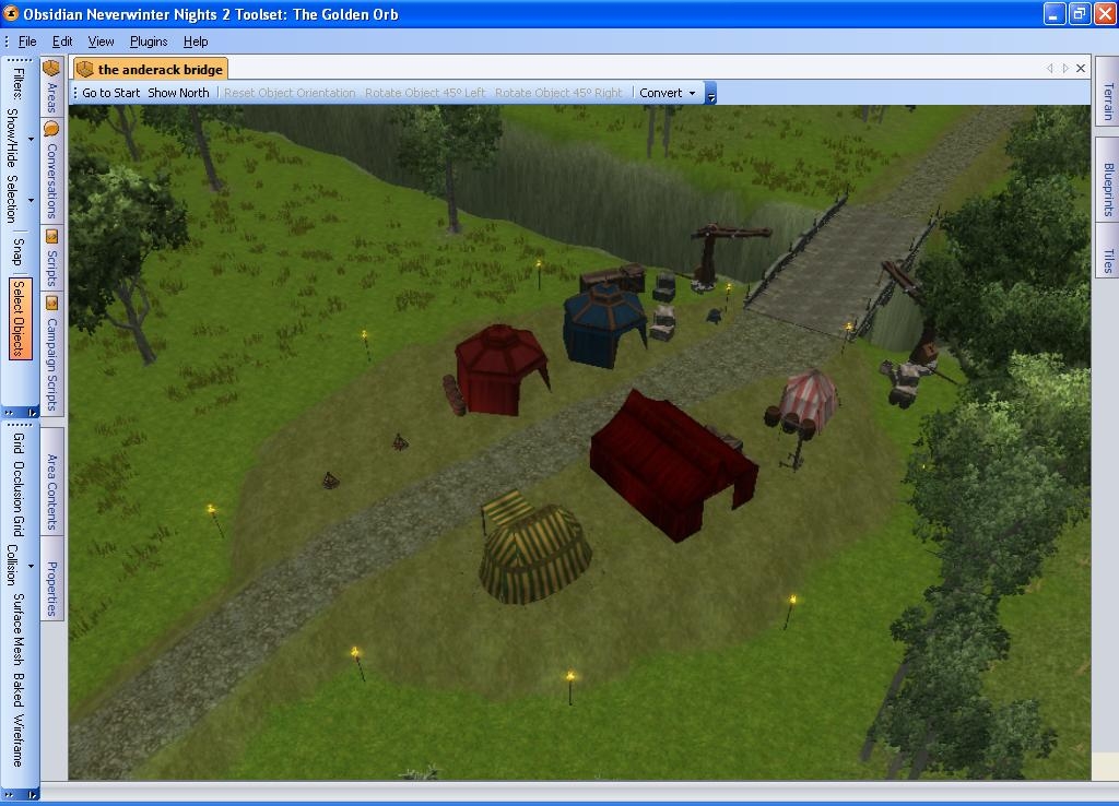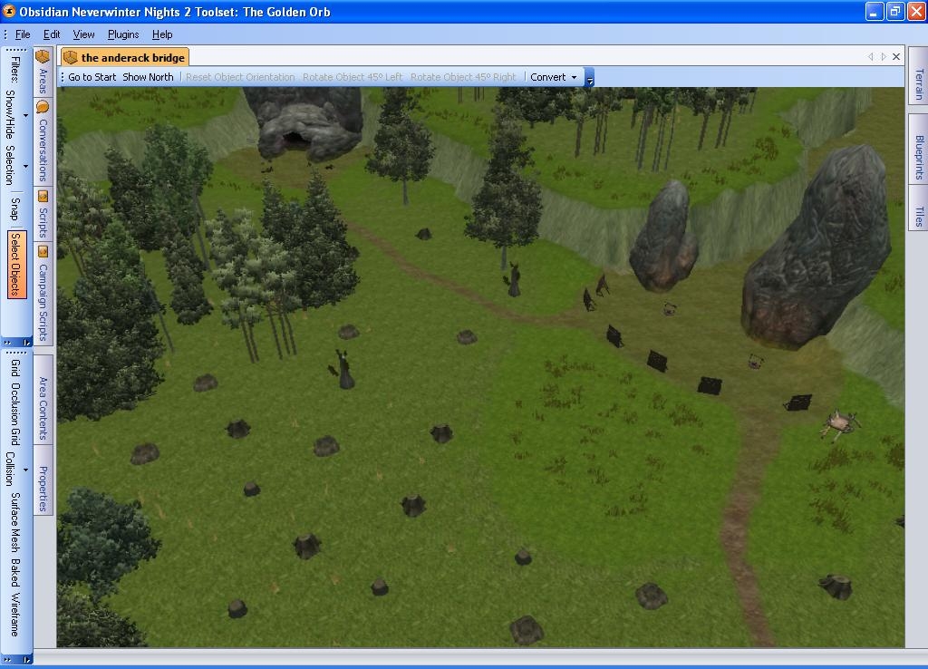 This is my 5th Ready to Submit area for the module that I am building. The walkable area is 32x24, and is much larger than my previous area's. This area features a ton of plants, mostly in the form of trees. A road runs across the southern portion of the area and leads to a bridge above a river canyon. Other features for this area include: A waterfall, done to the best of my current ability, scattered ruins, 2 different "camp" type area's, including one at the bridge. A fortified area at the mouth of a canyon at the northern edge of the area, a cave, some lighting and sound, and alot of placeables, some of which may only make sense to my particular mod. I have spent alot of time working on this area, but I realize that it is not perfect. There is alot of room for personalization. No interiors are included.