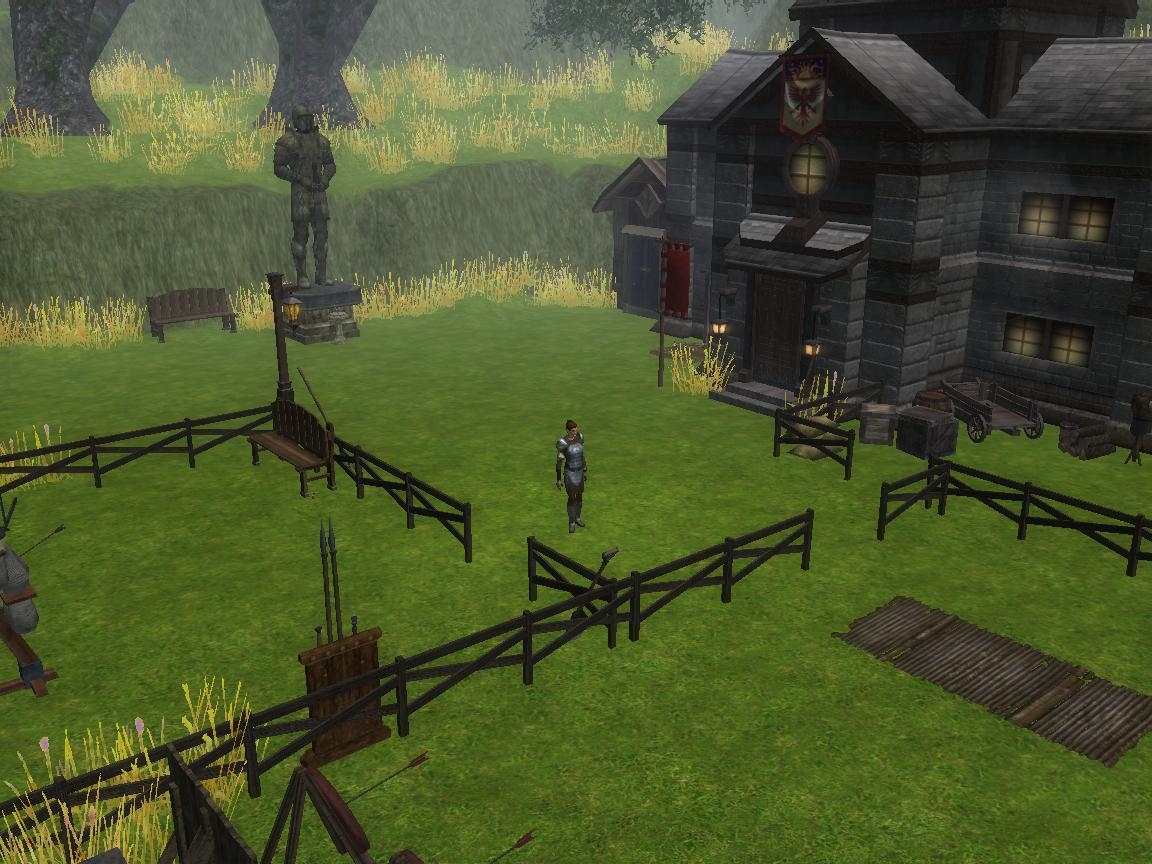 This is an area from a module I decided not to continue, but I thought some of the areas of the module were good. So, I thought I'd share this one. It's a training camp (Lyian camp in the module) with a "office" or inn style building. There's a shed next to that building, and two training sections split by fences. There is also a statue with an inscription, maybe for the camp's founder?
