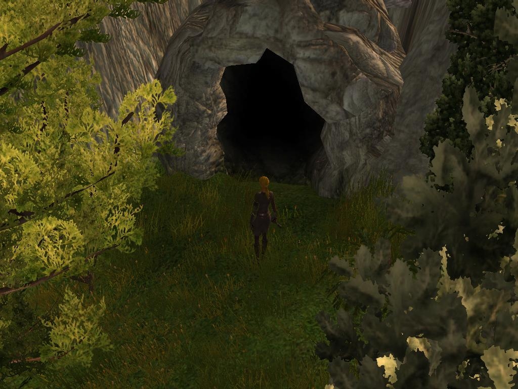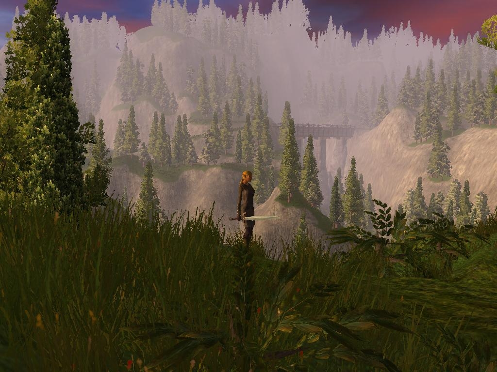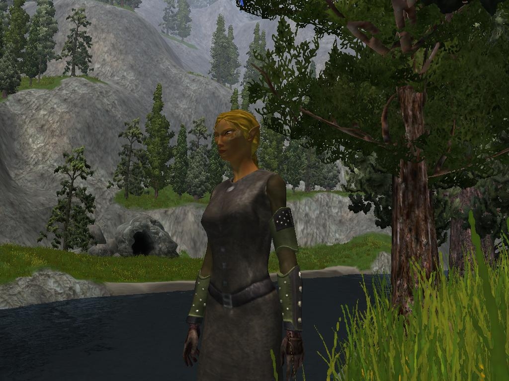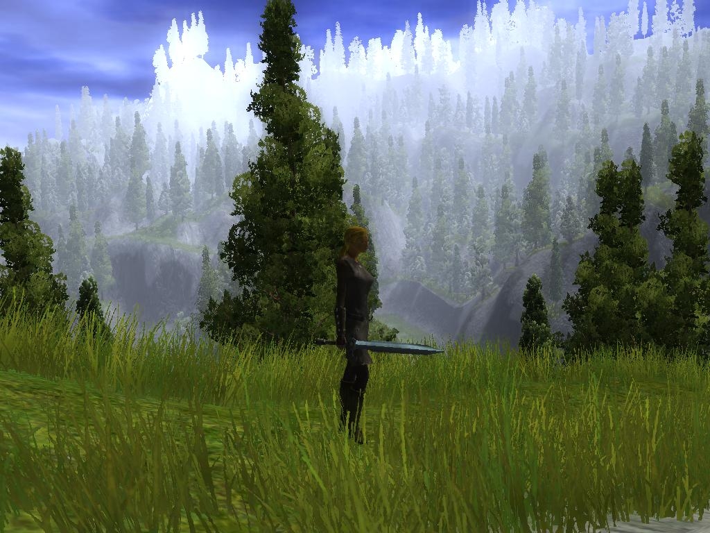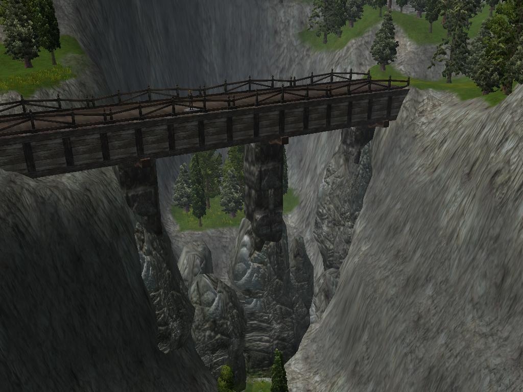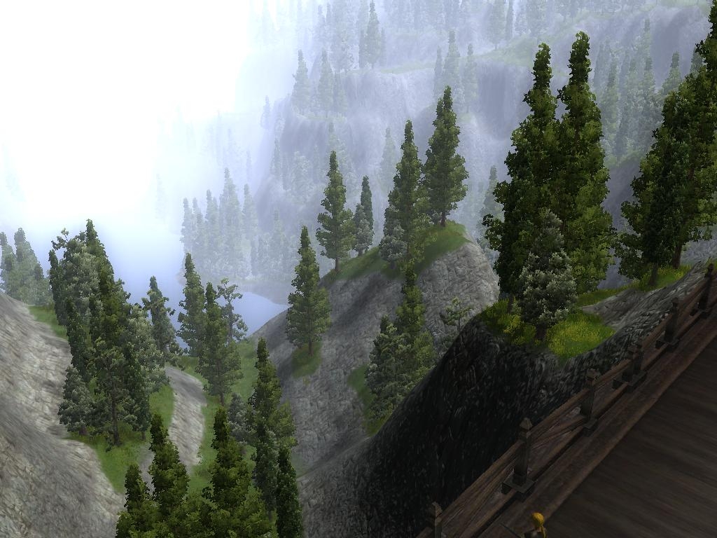 This area first started as a test area to see the best method for imitating the natural look of mountains. As such I wanted the most space to play around with so I made it 32x32. It evolved into such a good area that I decided to finish it out. When I started on my own PW I wanted to include it as the first of a chain of mountain areas to adventure through. This was back before all the studies of the effect of area size on server load and stuff (I started this the day after the toolset was released.) I still figured I would rather have a few really good outside areas that were large and had lots to do, than a bunch of small crammed in areas. For right now, the only walkable areas are the path, the bridge, the lake shore area, and a small glade with a cave off the side of the path. The whole east side of the map is untouched, but is available for someone who wants to spend the time adding paths and such. This version of the area is by no means complete... I only offer it up for others to finish as they see fit. It represents roughly 60 hours of experimentation, terrain editing, plopping down hundreds of trees, and texturizing. Everything that I do beyond what is here is specific to Cerea 2 so I can't release any more details (i.e. intended spawns, etc...)