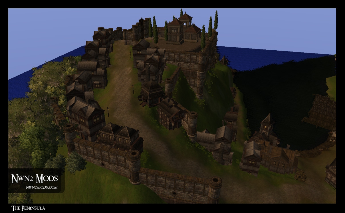 This NWN2 area consists of a town that exists below a large hill that extends onto a peninsula. At the top is a state building with other estates nearby. Though it is somewhat walled in, it is not a keep or military setup - thuough it could be quickly be changed to become one.