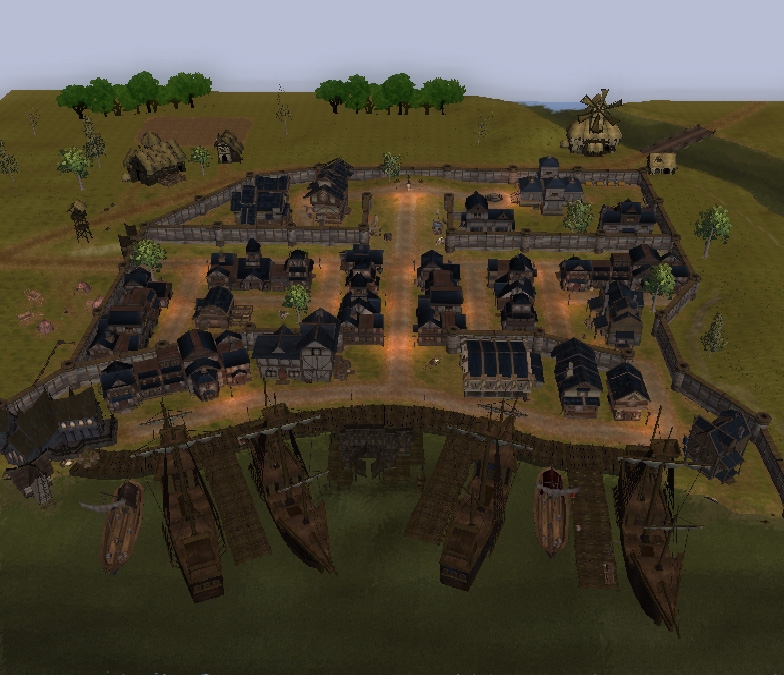 Good texturing. You might want to make your future towns/cities a bit less flat and less square. Take a look at some photographs of old european cities(the old town parts) and towns those where built around terrain features.
