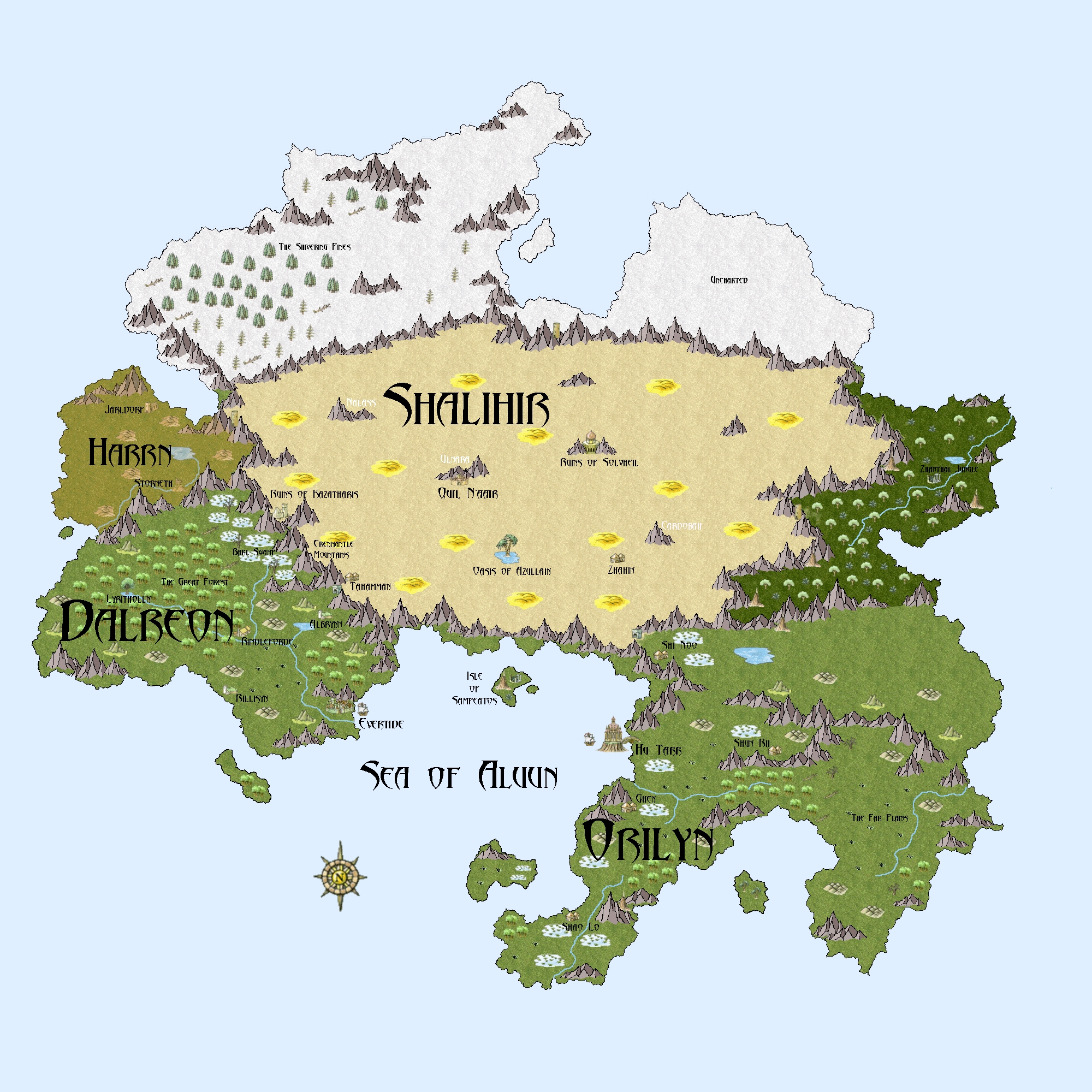 Situated at the split of the Thynoth River, where the Fen River heads north toward the Barl Swamp, lies Rindleforde.This walled city is built around its impressive docks that serve as the end of Dalreon's waterway. Beyond this point on the Thynoth River lies the Great Forest and the kingdom of Lyritholln. Having been kept from developing any further into the forest by the elves, Rindleforde represents a sort of border between civilized land and the untamed wild.
